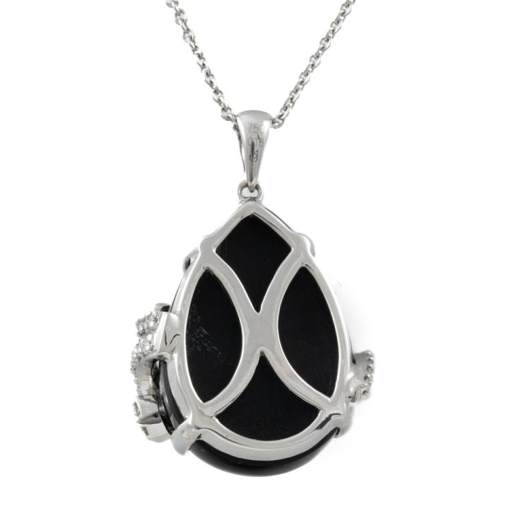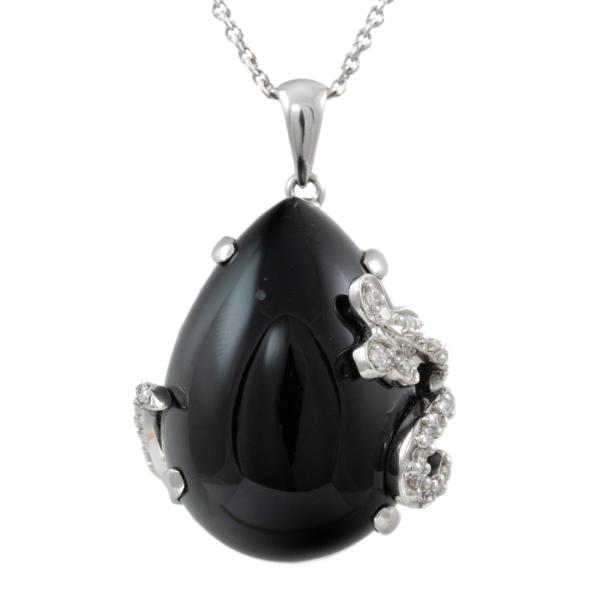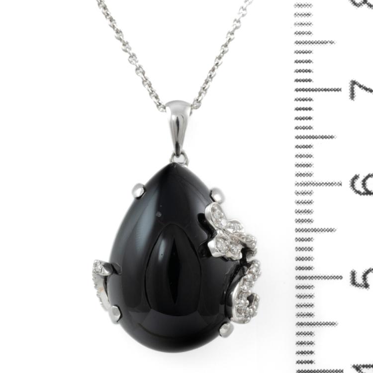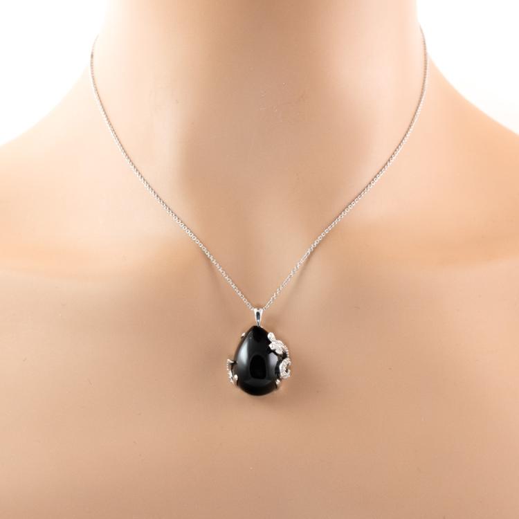 Onyx and Diamond pendant with a pear shape cabochon cut Onyx of size approximately 20mm x 14mm and round natural Diamonds totalling 0.18ct. 18ct white gold with 40cm 18ct white gold chain. Weight: 9.0g. (Pre-owned)