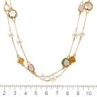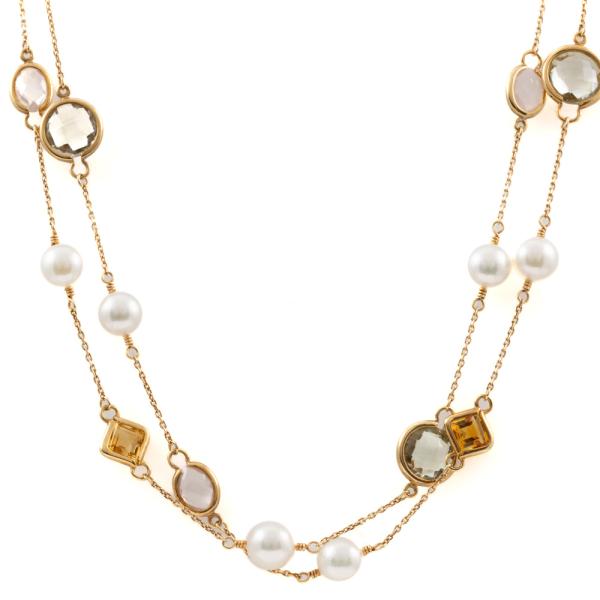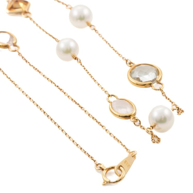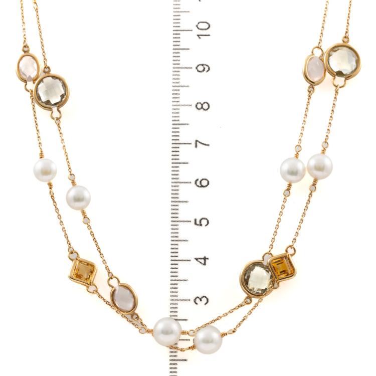 Rope length necklace with 13 round Akoya Pearls of 6.9mm and mixed shape & mixed colour natural Quartz (Including Citrine, Prasiolite - Green Quartz , Rose Quartz). 18ct yellow gold. Length: 86cm. Weight: 16.7g. (Pre-owned)