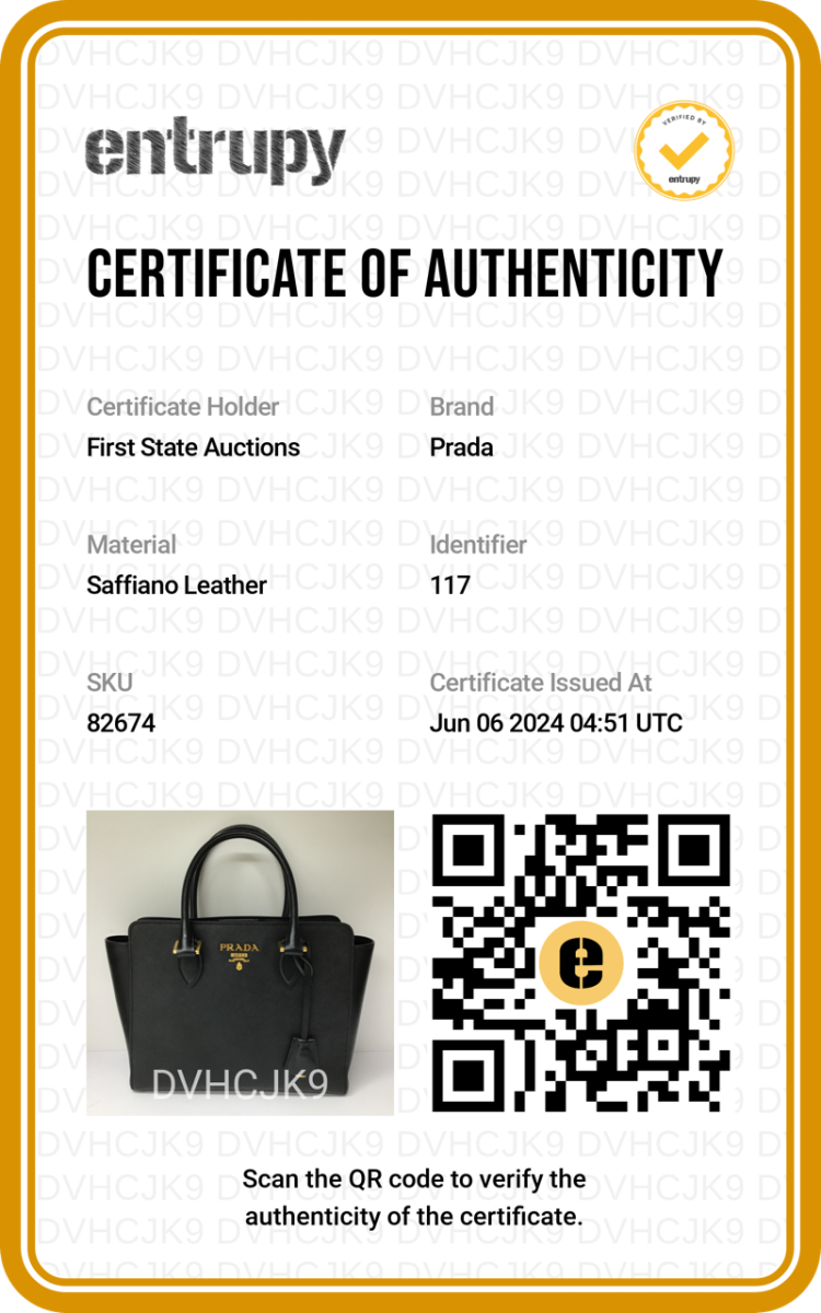 Prada tote bag in black Saffiano soft calfskin leather. Featuring rolled top handles, gold tone hardware, logo details at front. The top with magnetic button closure opens to a logo Jacquard nylon lining interior with zipper and patch pockets. Approximate dimensions: 26cm(W) x 21cm(H) x 10cm(D), 13cm handle drop, 54cm shoulder strap drop. Accompanied by a leather crochet & keyring, Prada certificate card and a dust bag. With Entrupy Certificate of Authenticity. (Pre-owned)