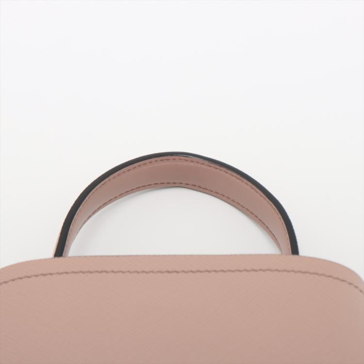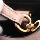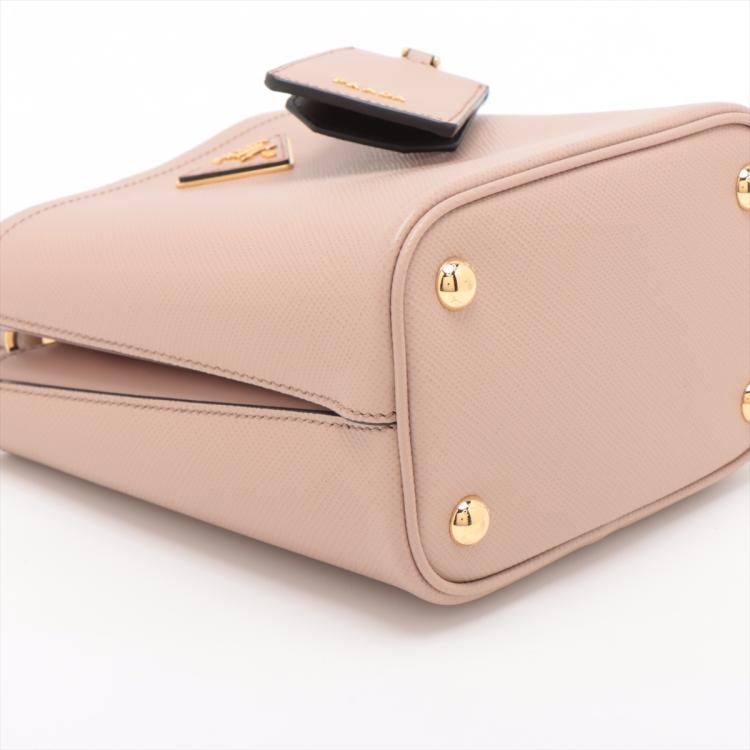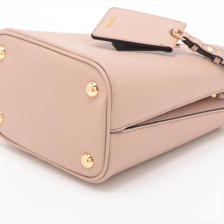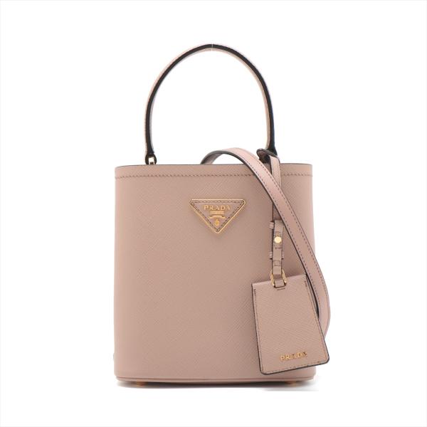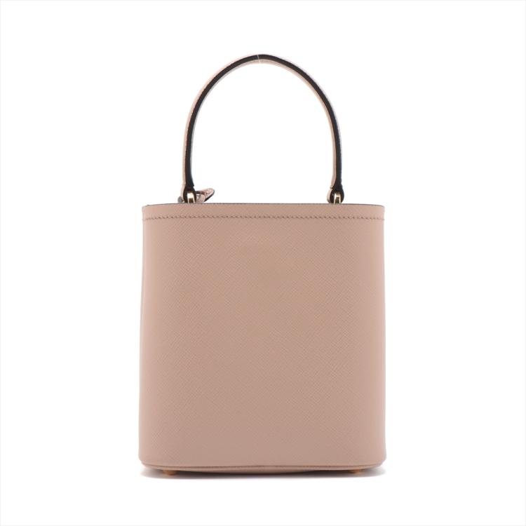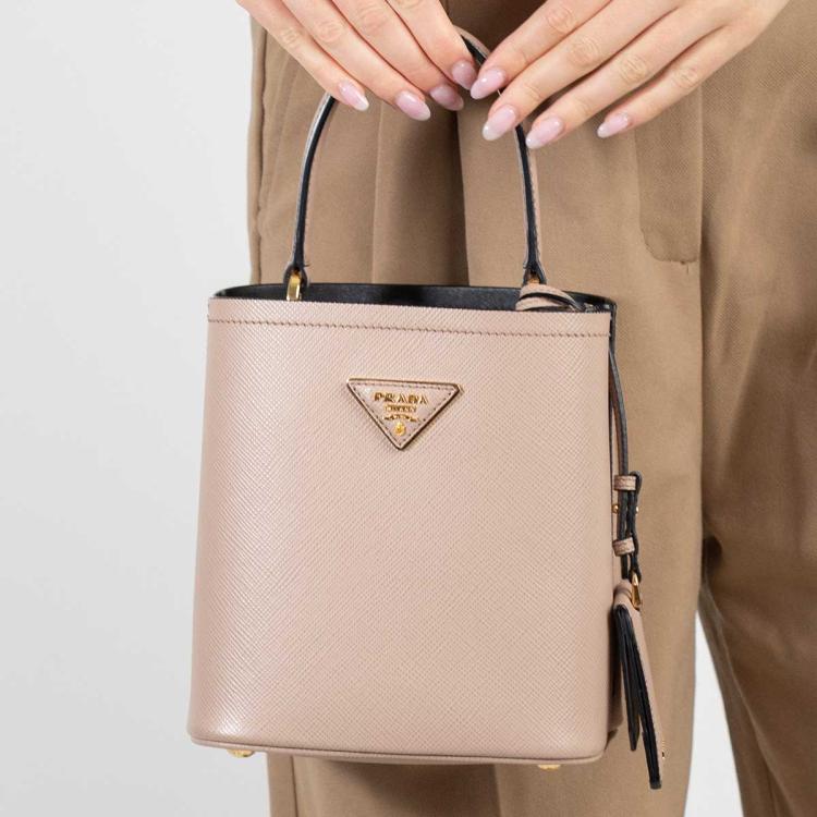 Prada small Panier bag in powder pink Saffiano leather. Featuring single leather handle, gold tone hardware, leather triangle plate with logo detail at the front, magnetic button closure on top. This opens to black Nappa leather lining interior with a centre pocket. Approximate dimensions: 17.5cm(W) x 18.5cm(H) x 11cm(D), 11cm handle drop, 51cm removable strap drop. Accompanied by Prada certificate card and dust bag. With Entrupy Certificate of Authenticity. (Pre-owned)