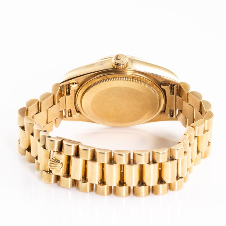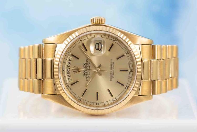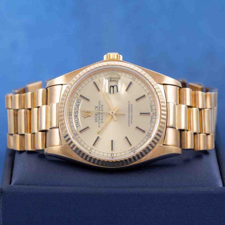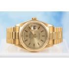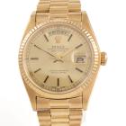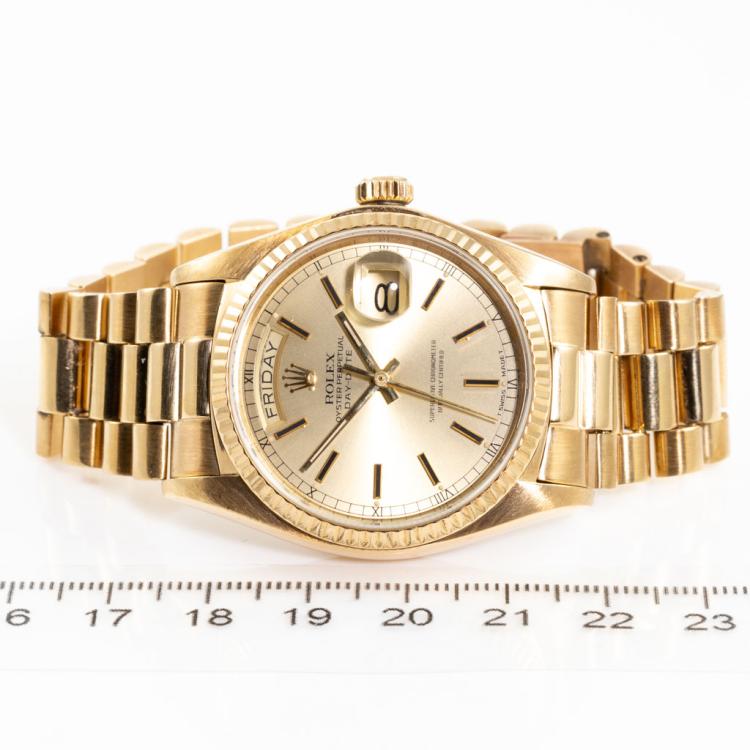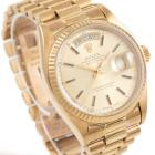 Rolex Oyster Perpetual Day Date 18ct yellow gold automatic mens watch. Gold dial, date, case diameter: 36mm, wrist size: 17.5cm, Swiss made. Ref# 18038. Circa: 1979. With Rolex 18ct yellow gold Presidential bracelet and clasp. With Certificate of Authenticity, undated Rolex Guarantee Certificate & Rolex Tax Invoice dated 16/12/2003. With Rolex box. 3 month FSA warranty (Pre-owned)