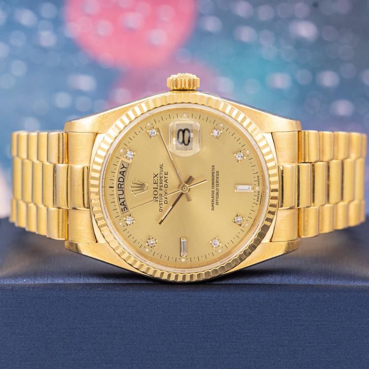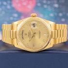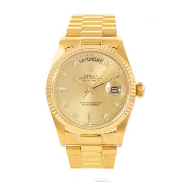 Rolex Oyster Perpetual Day Date 18ct yellow gold automatic watch. Gold dial, Diamond indicators, day & date, case diameter: 36mm, wrist size: 18cm, Swiss made. Ref# 18038A. Circa: 1988. With Rolex 18ct yellow gold Presidential bracelet and clasp. With Certificate of Authenticity, Rolex International Service Guarantee card dated 02/08/2012 and Rolex box. 3 month FSA warranty (Pre-owned)
