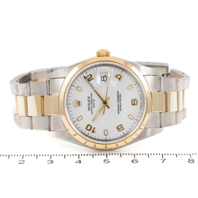 Rolex Oyster Perpetual Date 18ct yellow gold and stainless steel automatic watch. White dial, date, case diameter: 34mm, wrist size: 18.5cm, Swiss made. Ref# 15203. Circa: 2000. With Rolex two tone Oyster bracelet and clasp. With Certificate of Authenticity, Rolex International Guarantee card dated 8/07/2007 and Rolex book. 3 month FSA warranty. (Pre-owned)