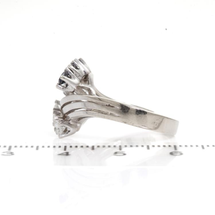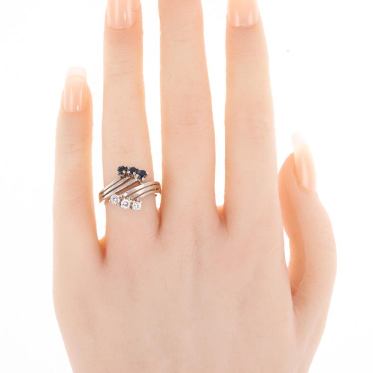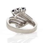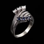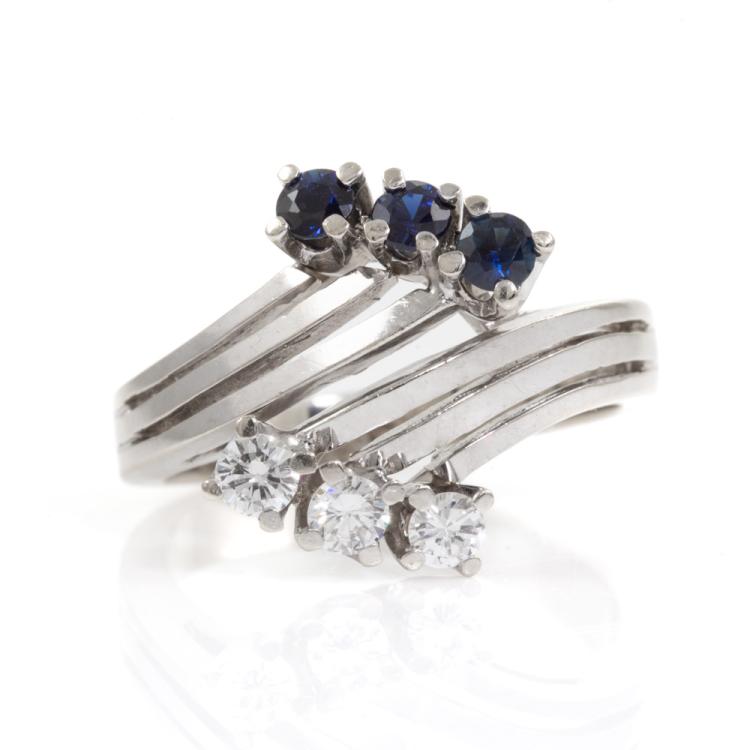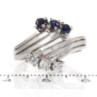Sapphire and Diamond ring with 3 round Natural blue Sapphires totalling approximately 0.15cts and round Natural Diamonds totalling approximately 0.20cts. 14ct white gold. Ring size: L. Band width: 3.6mm - 3.0mm. Weight: 5.1g. Note rhodium plating faded. (Pre-Owned)