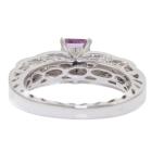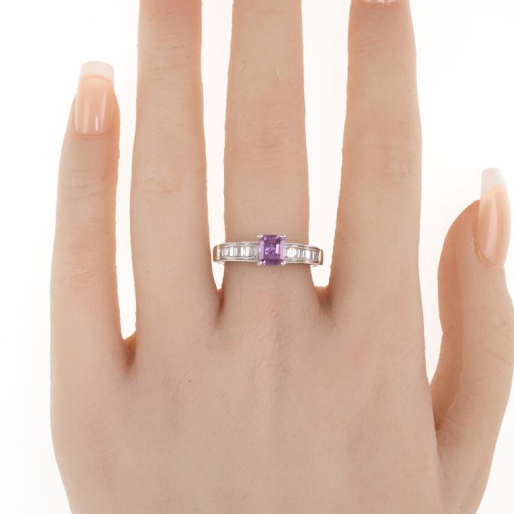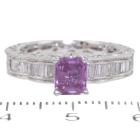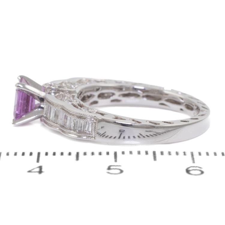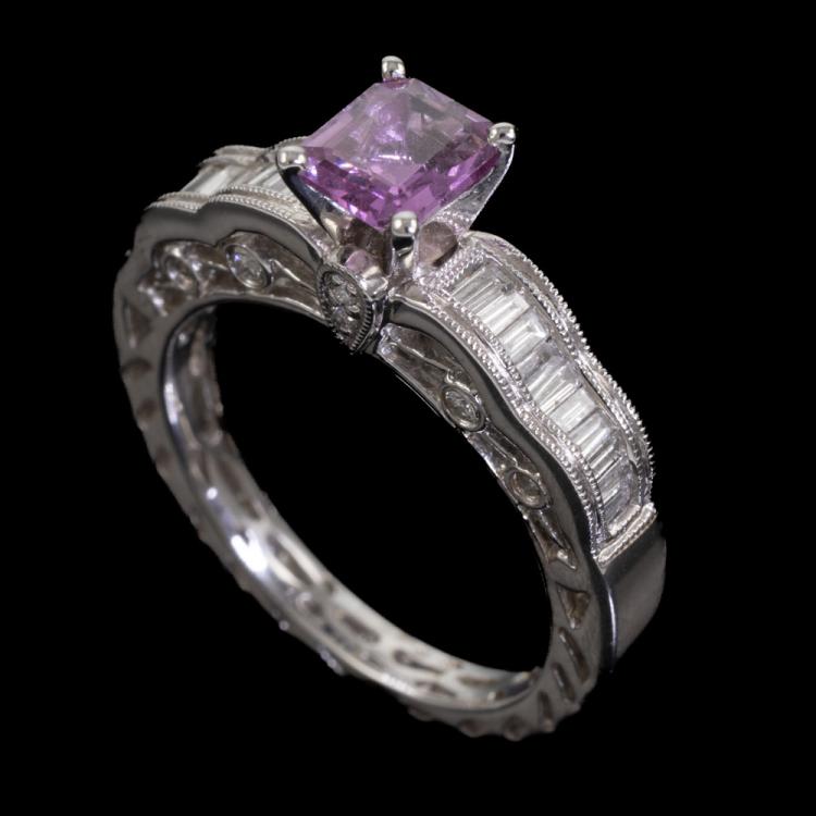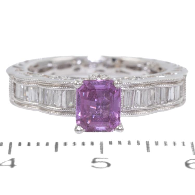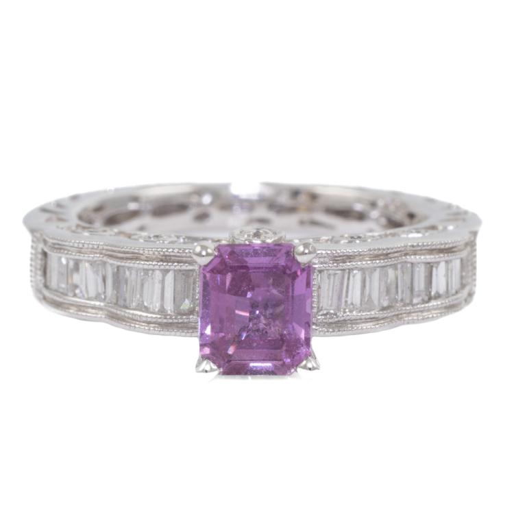 Sapphire and Diamond ring with an emerald cut natural purplish pink Sapphire of 0.88ct and round & baguette cut natural Diamonds totalling 0.37ct (Estimated grading: H -I SI). 18ct white gold. Ring size L. Band width: 2.3mm-3.4mm. Weight: 5.8g. (As new)