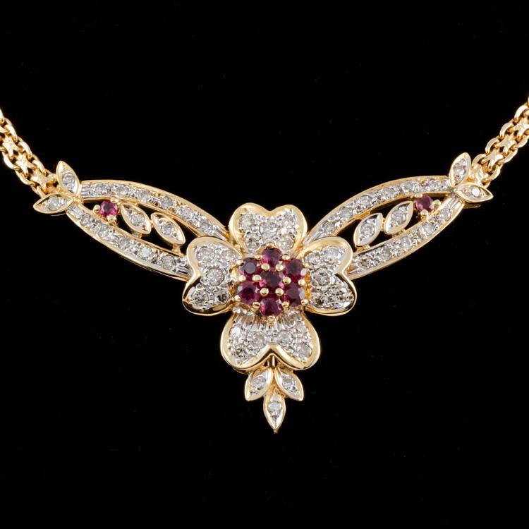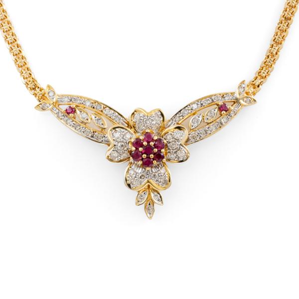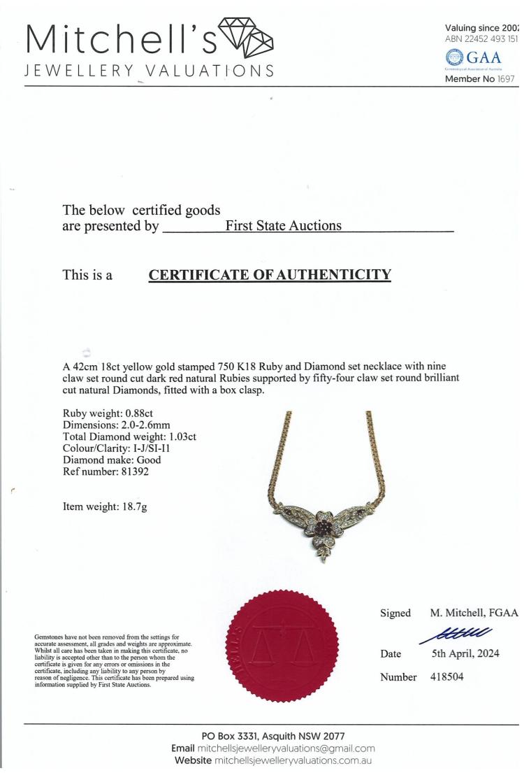 Ruby and Diamond necklace with round natural Rubies totalling 0.88ct and natural Diamonds totalling 1.03ct (Estimated grading: I-J SI-P1). 18ct yellow and white gold with 42.0cm chain. Weight: 18.7g. With certificate #418504. (Pre-owned)