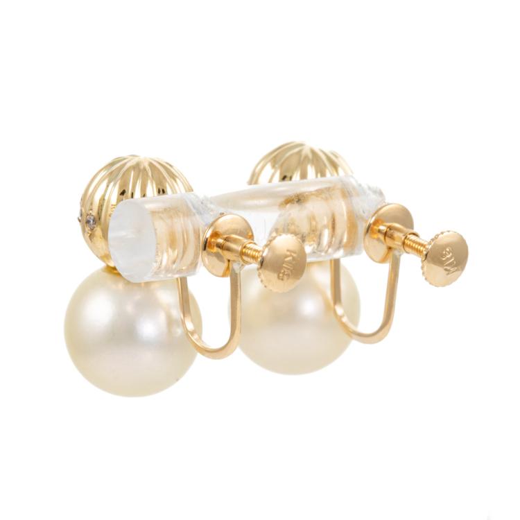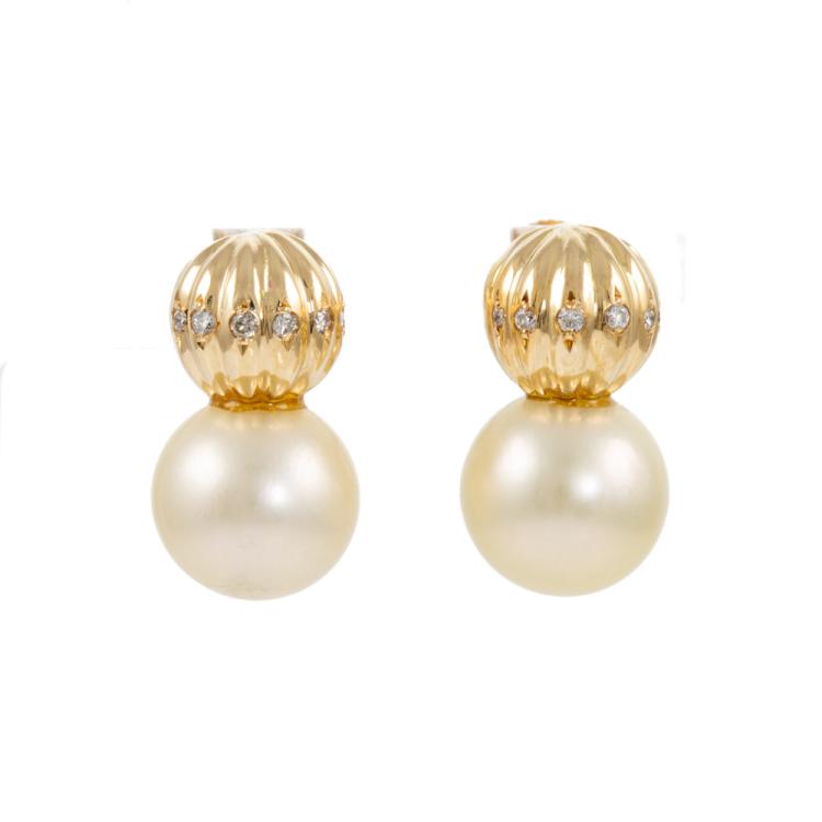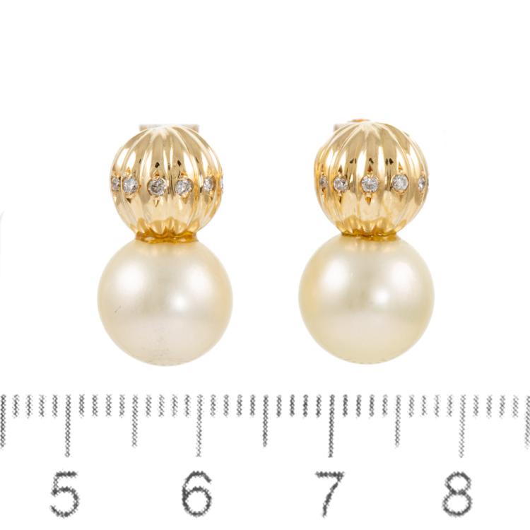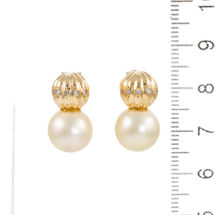 Pearl and Diamond screwback earrings with 2 South Sea Pearl of 10.2mm and round Natural Diamonds totalling 0.12ct. 18ct yellow gold. Weight: 7.1g. (Pre-owned)