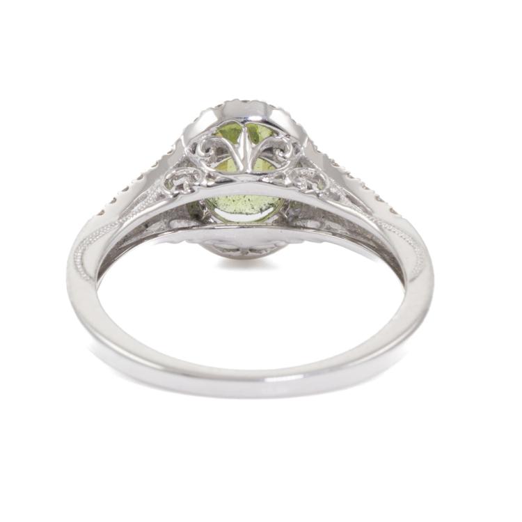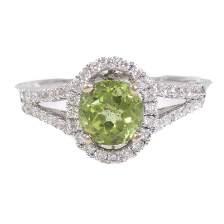 Peridot and Diamond ring with round natural Peridot of 1.15ct and surrounding round natural Diamonds totalling 0.35ct (Estimated grading: H SI). 18ct white gold. Ring size N. Band width: 1.5mm - 2.5mm. Weight: 3.7g. (New)