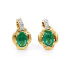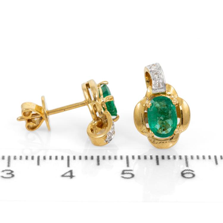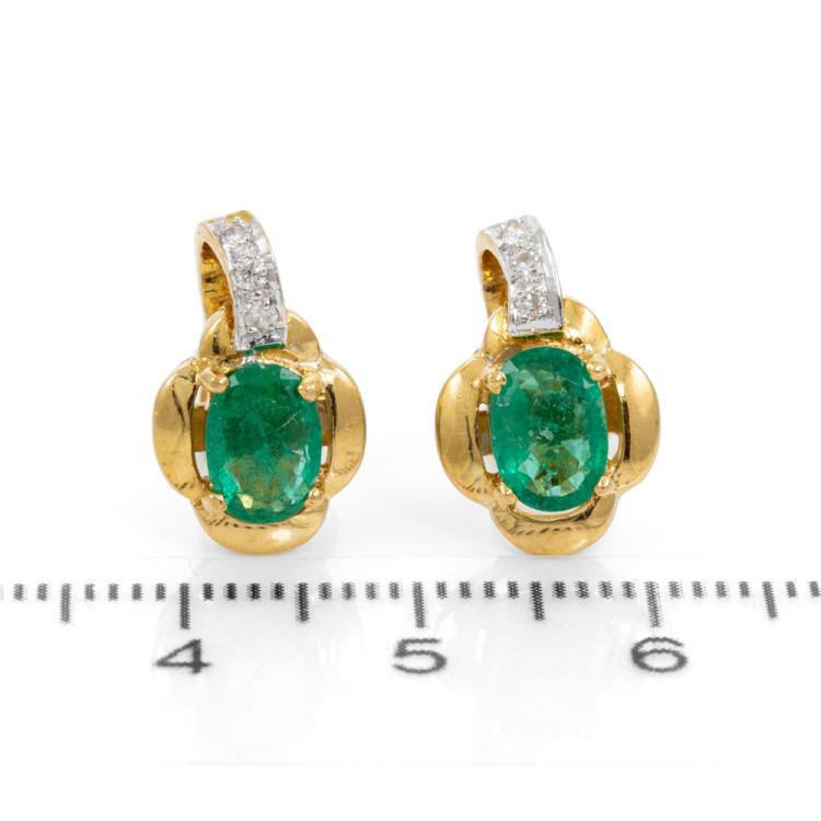 Emerald and Diamond earrings with 2 oval shape natural Emeralds totalling approximately 1.30cts and round natural Diamonds totalling 0.06cts. 18ct yellow gold. Weight: 4.7g (Pre-owned)