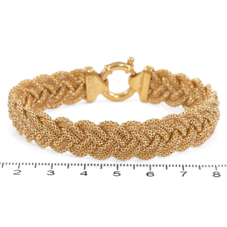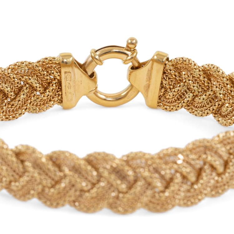 Gold Bracelet with a twisted wire braided design with a spring ring clasp. 18ct yellow gold. Length: 19.5cm. Width: 12.2mm.Weight: 26.5g. (Pre-owned)
