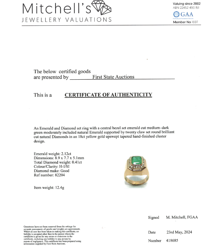 Emerald and Diamond ring with emerald cut Natural Emerald of 2.12ct and round Natural Diamonds totalling 0.41ct (Estimated grading: H-I SI). 18ct yellow gold. Ring size Q1/2. Band width: 4.3mm - 6.0mm. Weight: 12.4g. With Certificate #418685. (Pre-owned)