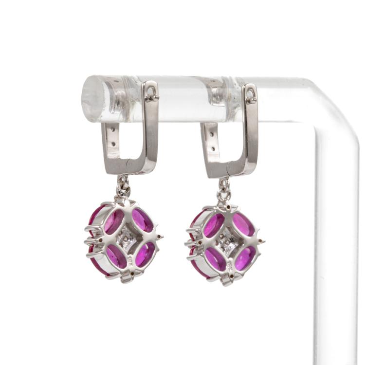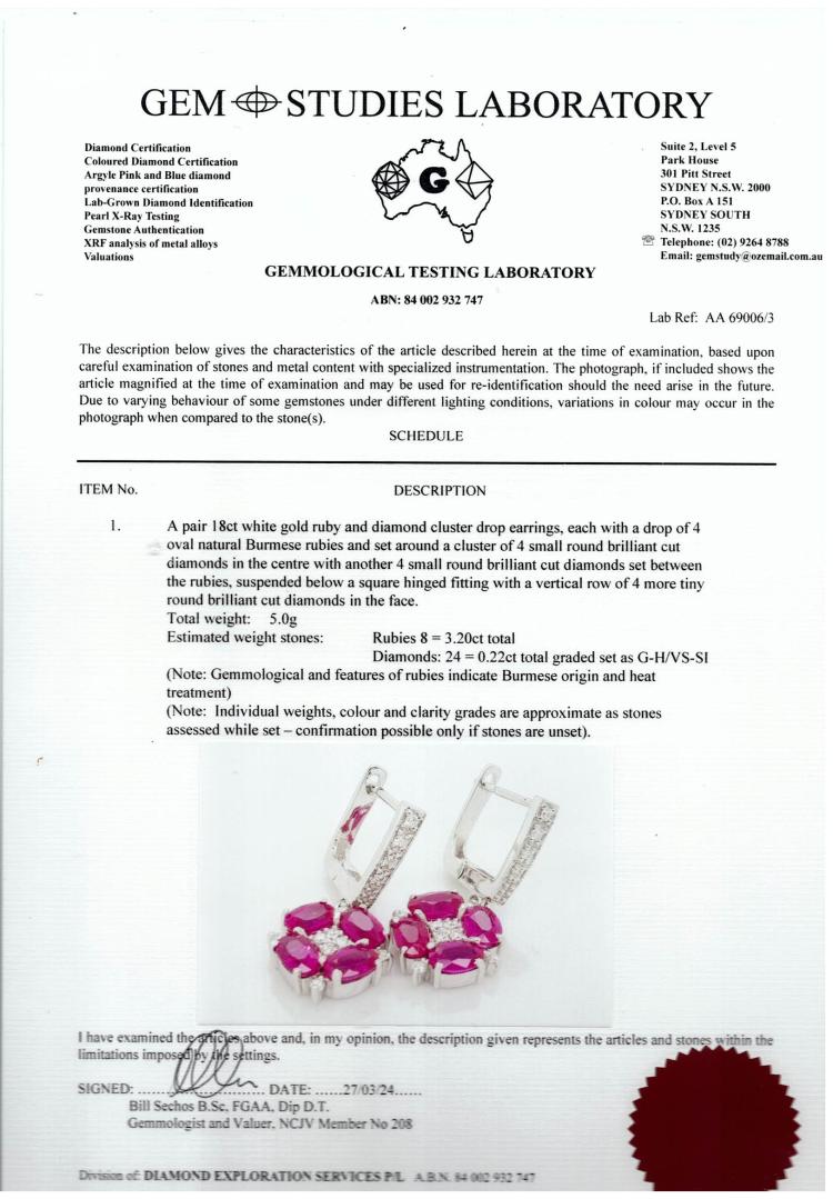 Ruby and Diamond earrings with 8 oval shape Natural Burmese Rubies totalling 3.20ct and round Natural Diamonds totalling 0.22ct. 18ct white gold. Weight: 5.0g. With GSL Description #AA69006/3. (Pre-owned)