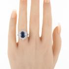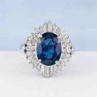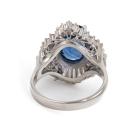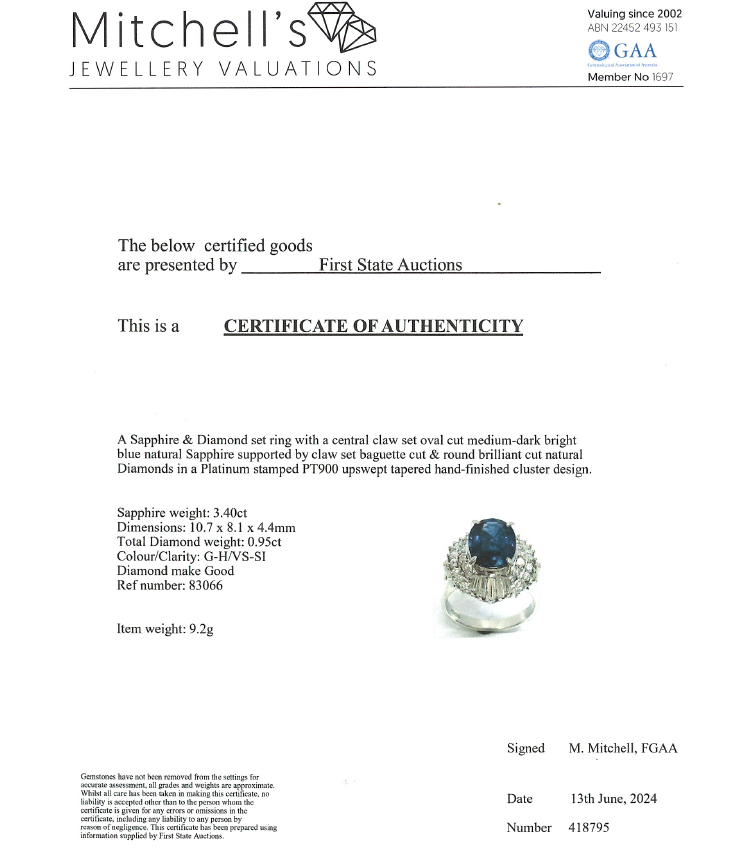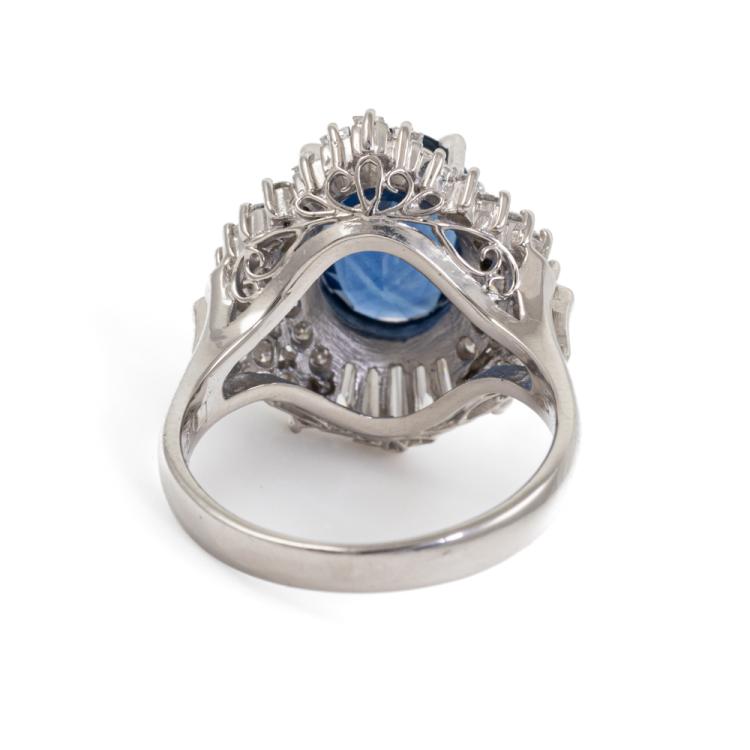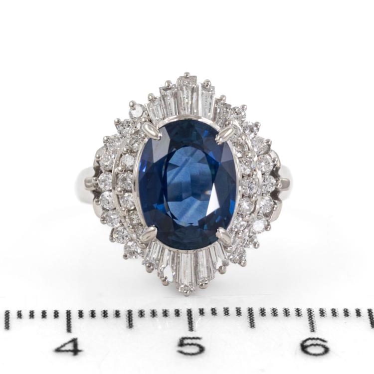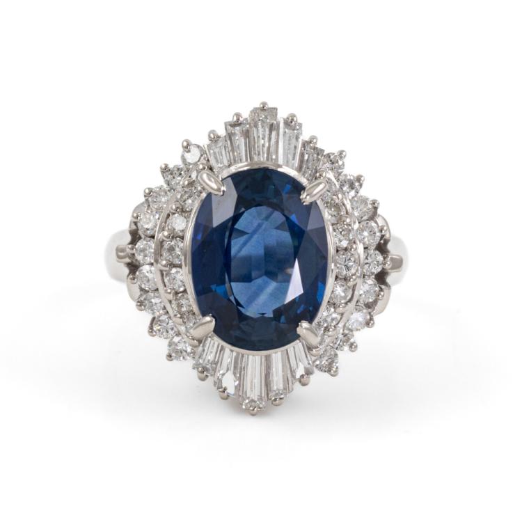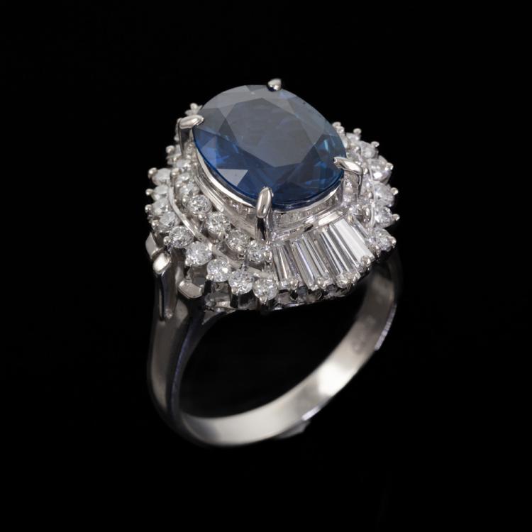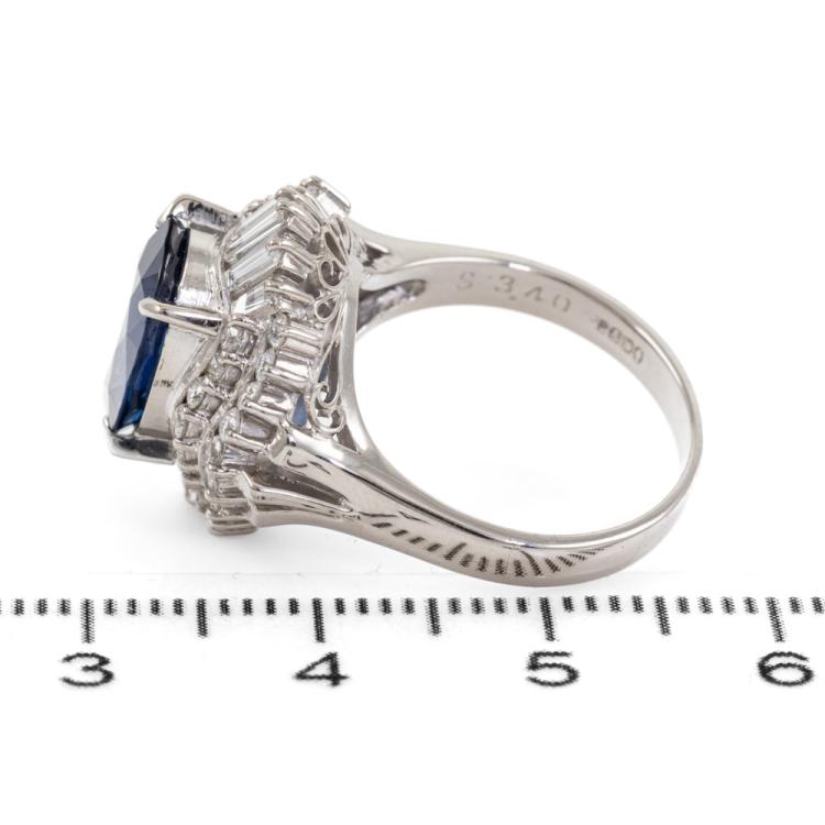 Sapphire and Diamond ring with oval shape natural blue Sapphire of 3.40ct and round & baguette cut natural Diamonds totalling 0.95ct (Estimated grading: G-H VS-SI). Platinum 900. Ring size K1/2. Band width: 2.5mm - 4.0mm. Weight: 9.2g. With Certificate #418795. (Pre-owned)