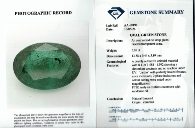 A loose oval shape natural Zambian Emerald of 5.05ct (With GSL Report #AA69191). Dimension: 13.58 x 9.44 x 5.89. (Pre-owned)