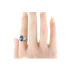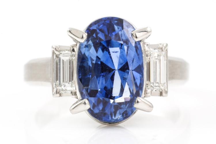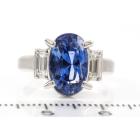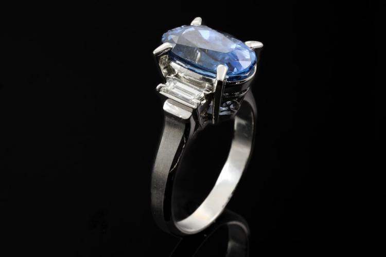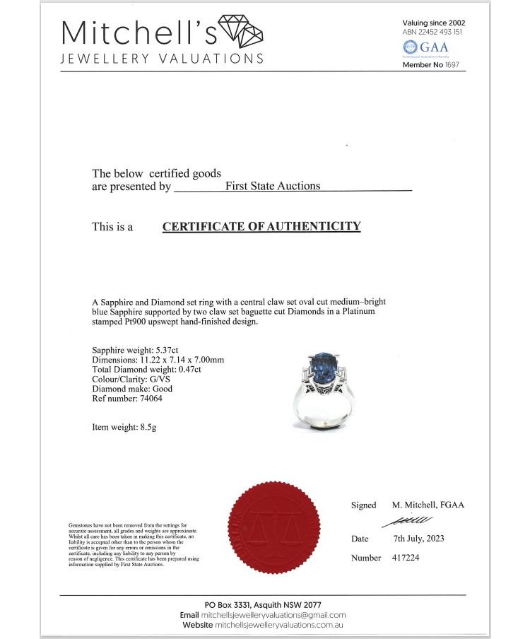 Sapphire and Diamond ring with oval shape blue Natural Sapphire of 5.37ct and baguette cut Natural Diamonds totalling 0.47cts (Estimated grading: G VS). Platinum - 900. Ring size J1/2. Weight: 8.5g. With certification #417224. (Pre-owned)