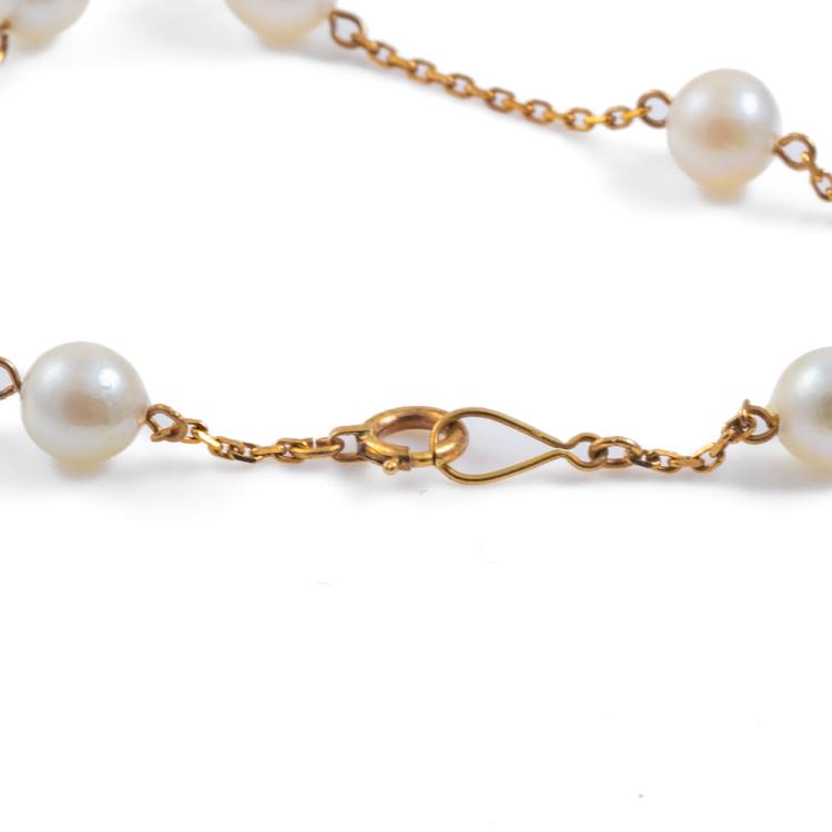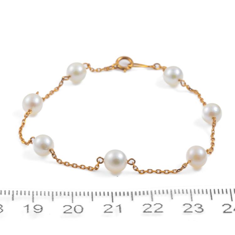 Pearl bracelet with 7 Cultured Pearl of 5.9mm - 5.6mm. 18ct yellow gold. Length: 17cm. Weight: 2.8g. (Pre-owned)