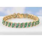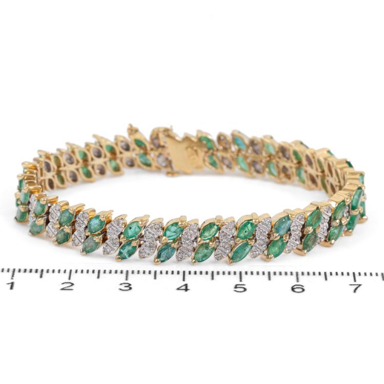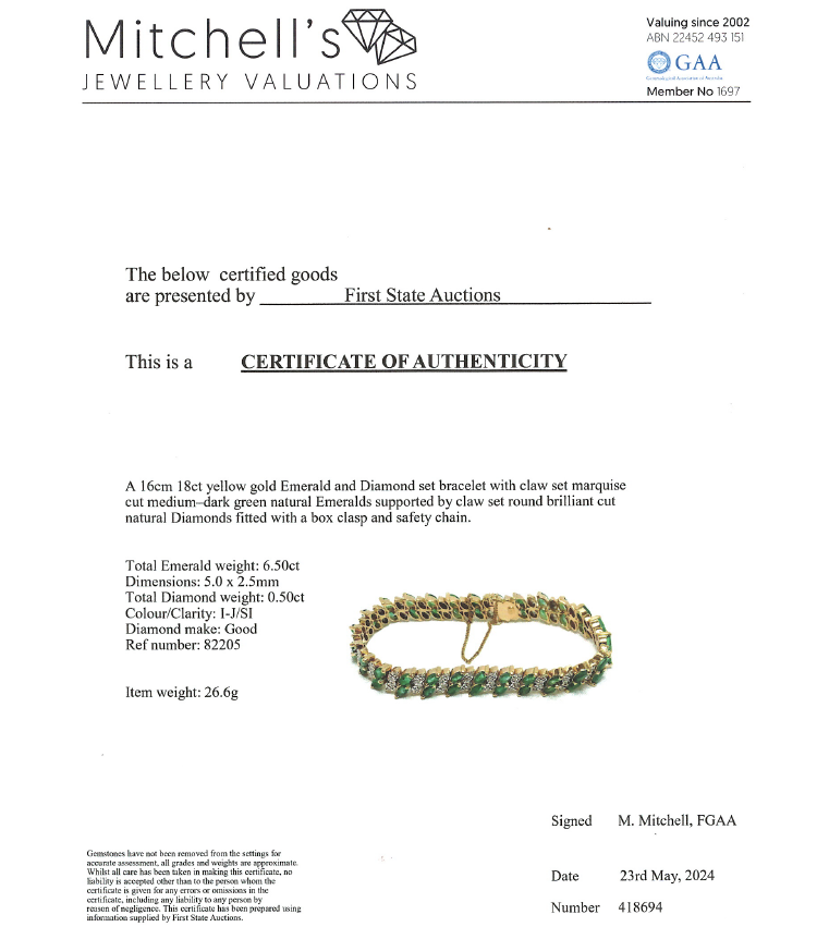 Emerald and Diamond bracelet with marquise cut natural Emerald totalling 6.50ct and round natural Diamonds totalling 0.50ct (Estimated grading: I-J SI). 18ct yellow gold. Length: 16cm. Weight: 26.6g. With Certificate #418694. (Pre-Owned)