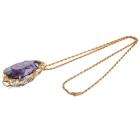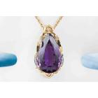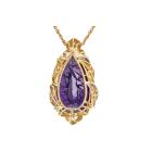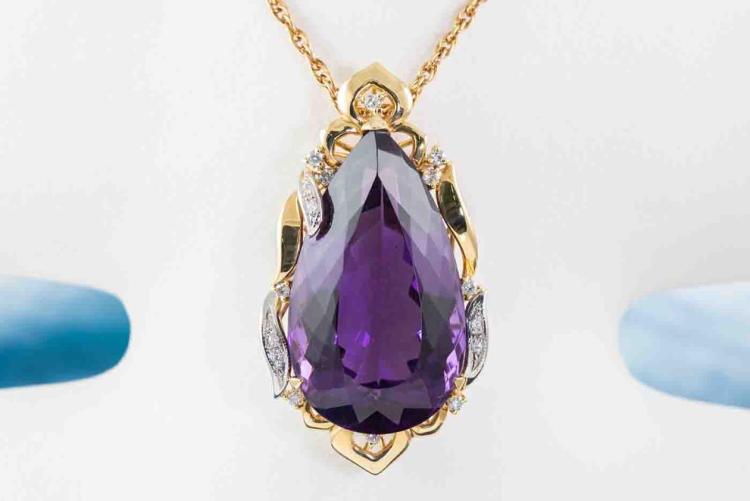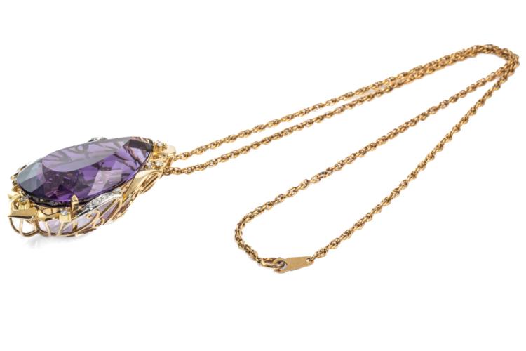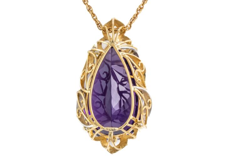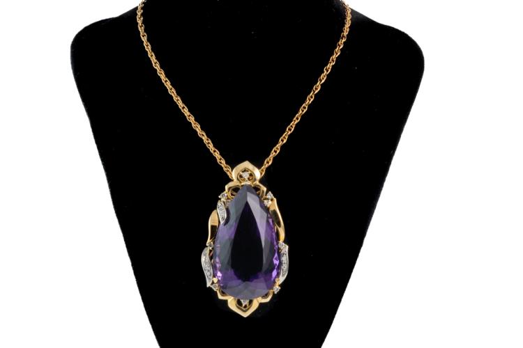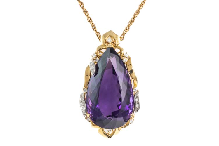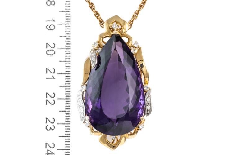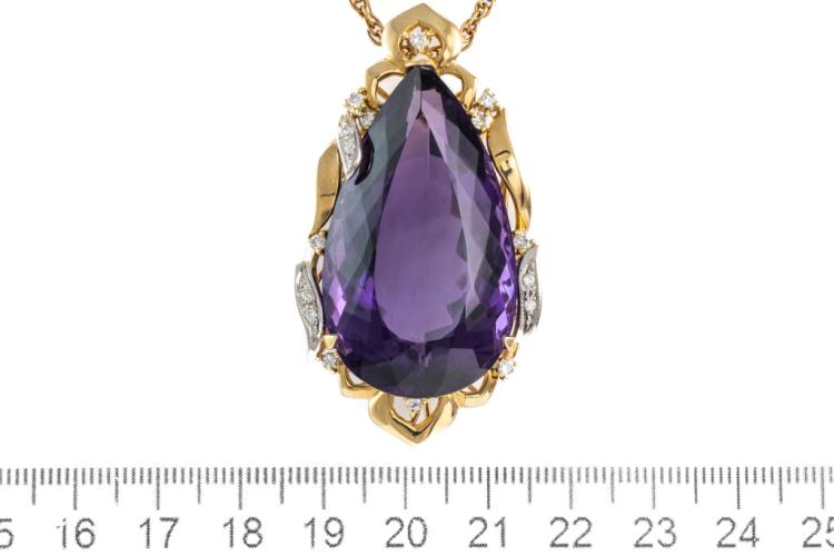 Amethyst and Diamond pendant with a pear shape Natural Amethyst of 77.44ct and round Natural Diamonds totalling 0.41ct (Estimated grading: H-I SI). 18ct yellow gold and platinum 900 with 56cm 18ct yellow gold chain. Weight: 38.6g. With certificate #417473. (Pre-owned)