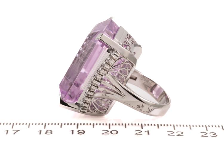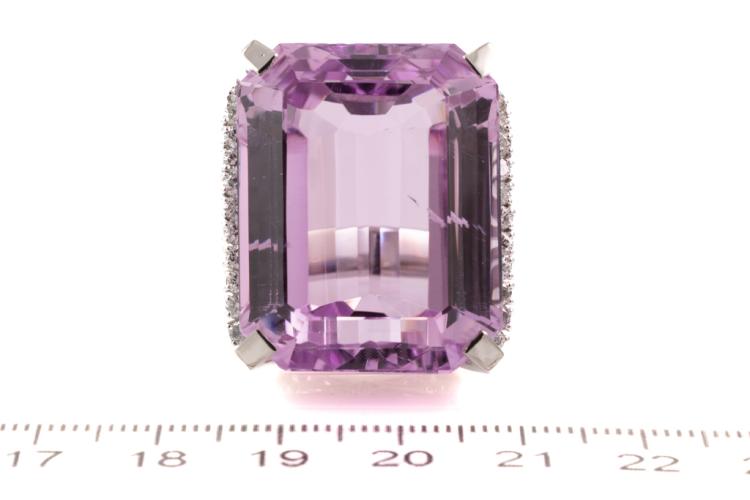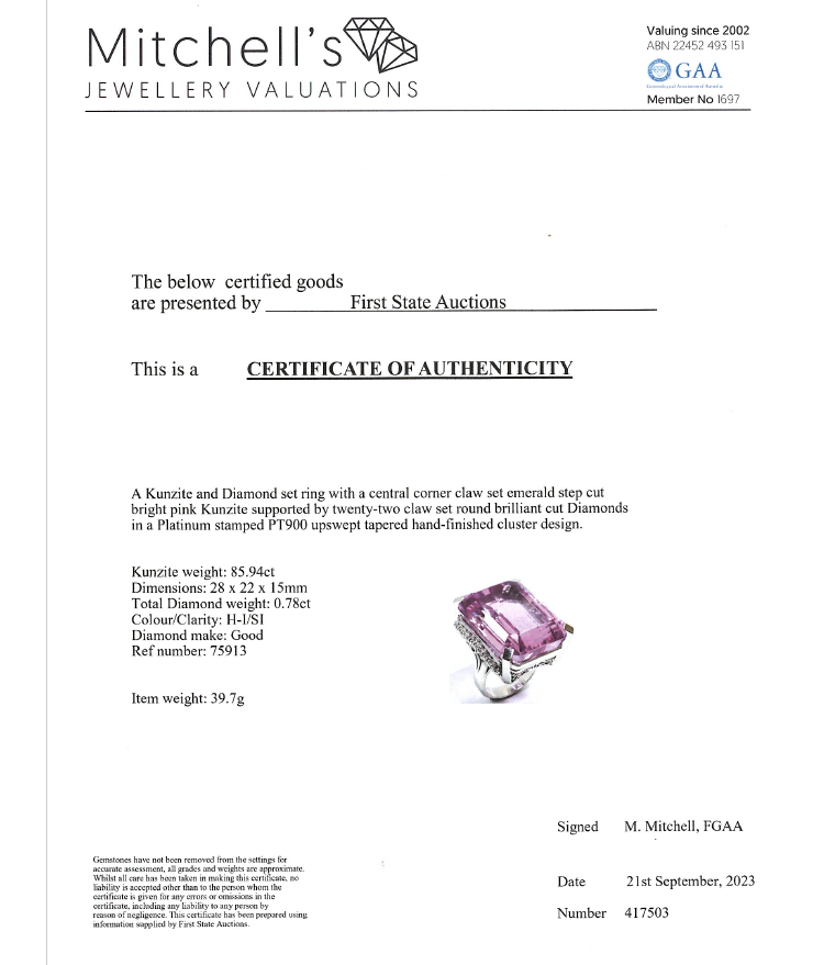 Kunzite and Diamond ring with an emerald cut Natural Kunzite of 85.94ct and round Natural Diamonds totalling 0.78ct (Estimated grading: H-I SI). Platinum 900. Ring size P. Weight: 39.7g. With Certificate #417503. (Pre-owned)