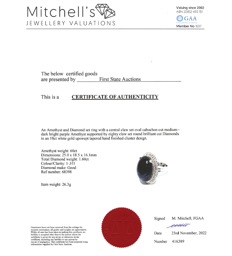 Amethyst and Diamond ring with oval cabochon Amethyst of 60.00ct and round natural Diamonds totalling 1.60cts (Estimated grading: I-J P1). 18ct white gold. Ring size P . Weight: 26.3g. With certificate #416389. (Pre-owned)