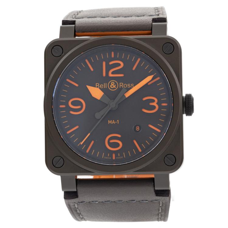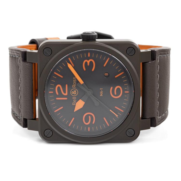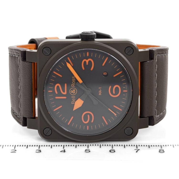 Bell & Ross Instruments Pilot Limited Edition of 999 ceramic automatic mens watch. Matte Khaki dial, date, case diameter: 42mm, strap length: 21cm, Swiss made. Ref# BR0392-KAO-CE/SCA. With Bell & Ross brown leather strap. With Unstamped Bell & Ross Warranty card and Bell & Ross box. With 3 month FSA warranty (As new, Note: minor wear marks on strap due to being display stock)