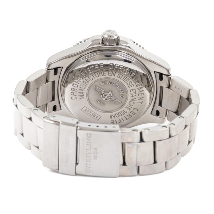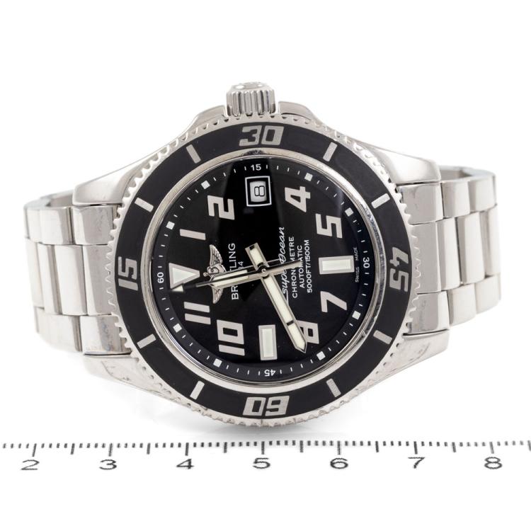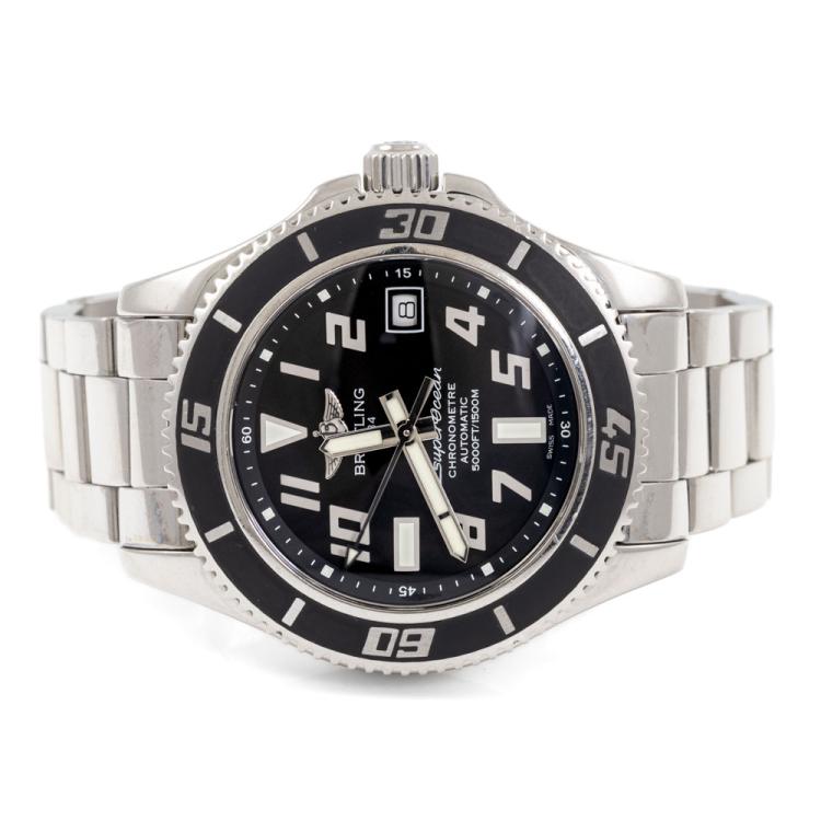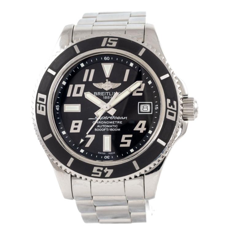 Breitling Superocean stainless steel automatic mens watch. Black dial, date, case diameter: 42mm, wrist size: 17cm, Swiss made. Ref #A17364. With Breitling stainless steel bracelet & clasp. With Certificate of Authenticity, Undated Breitling international warranty booklet and Breitling box. 3 month warranty. (Pre-owned)
