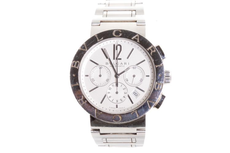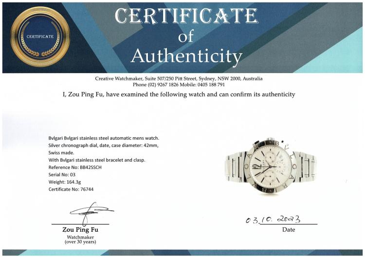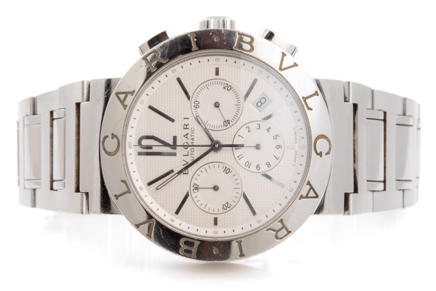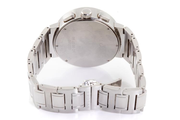 Bvlgari Bvlgari stainless steel automatic mens watch. Silver chronograph dial, date, case diameter: 42mm, wrist size: 19.5cm, Swiss made. Ref# BB42SSCH. With Bvlgari stainless steel bracelet and clasp. With Certificate of Authenticity, Undated Bvlgari International Warranty Booklet and Bvlgari box. 3 month FSA warranty (Pre-owned)