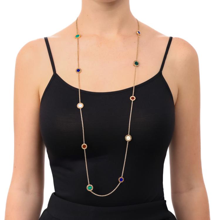 Bvlgari Bvlgari necklace. Featuring 3 Malachite - 12.9mm diameter, 3 Mother of Pearl - 12.9mm diameter, 3 Lapis Lazuli - 10.9mm diameter and 3 Carnelian - 10.9mm diameter elements. 18ct rose gold. Length: 101cm. Weight: 39.8g. Made in Italy. With Bvlgari certificate dated 31/12/2015. (Pre-owned)