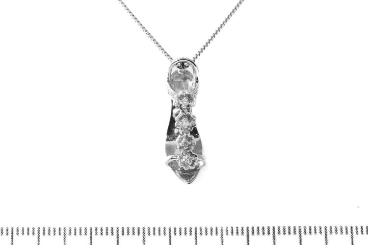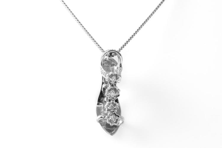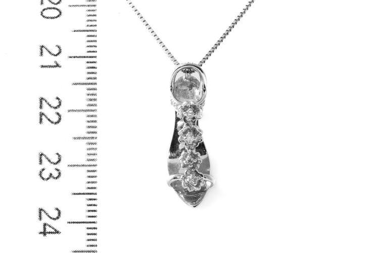 Diamond high heel shoe designed pendant with round natural Diamonds totalling approximately 0.03cts. 14ct white gold with 44cm 18ct white gold adjustable chain. Weight: 4.4g. (Pre-owned)