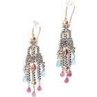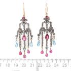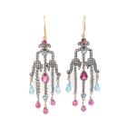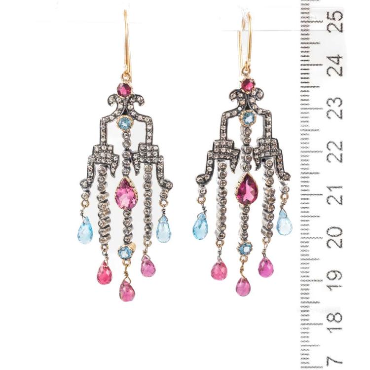 Gemstones and Diamond chandelier earrings with round & pear shape natural pink Tourmalines totalling approximately 1.00cts, round natural blue topaz totalling 0.20cts, Pink Tourmaline & blue Topaz briolette beads of size 6.4x3.5mm & 4.8x3.5mm and rose cut natural Diamonds totalling approximately 0.60cts (Estimated grading: N SI - note: one Diamond missing). 16ct yellow gold hooks (XRF tested, not stamped) and white base metal. Weight: 12.0g. (Pre-owned)^