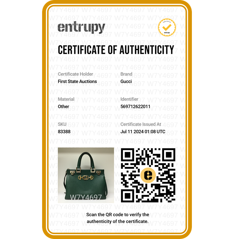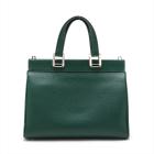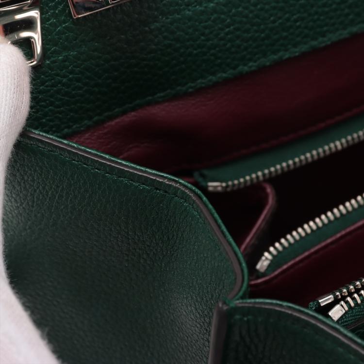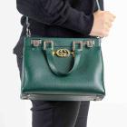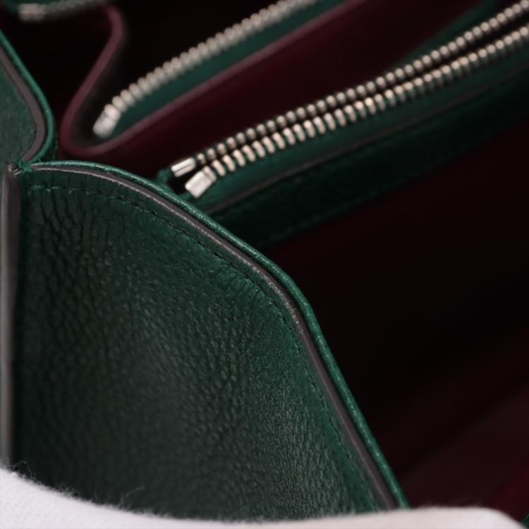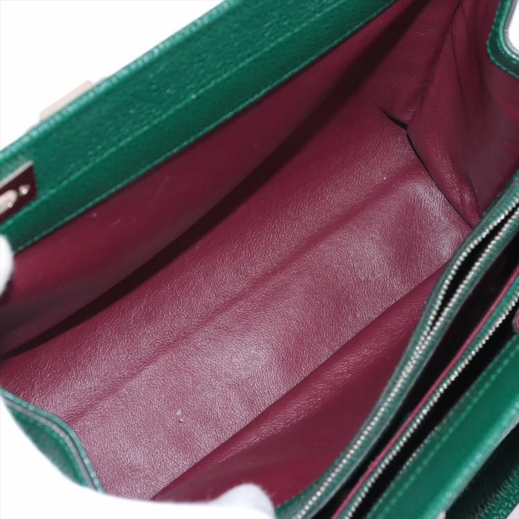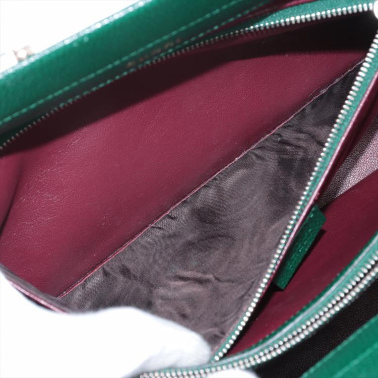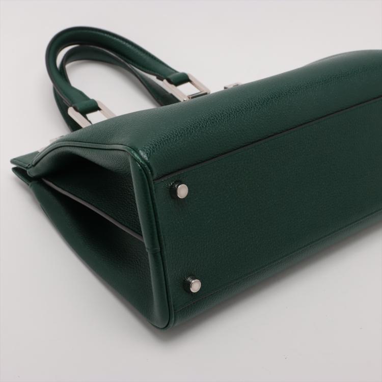 Gucci small Zumi top handle bag in green calfskin. Featuring interlocking G Horsebit logo on front, silver & gold tone hardware, flat handles & single shoulder strap. Turn-lock closures on sides open to a dark red leather lining with 2 compartments divided by a middle zipper pocket. Approximate dimensions: 28cm(L) x 21cm(H) x 12cm(D), 11.5cm handle drop & 49cm adjustable strap drop. Accompanied by a Gucci box. With Entrupy Certificate of Authenticity. (Pre-owned)