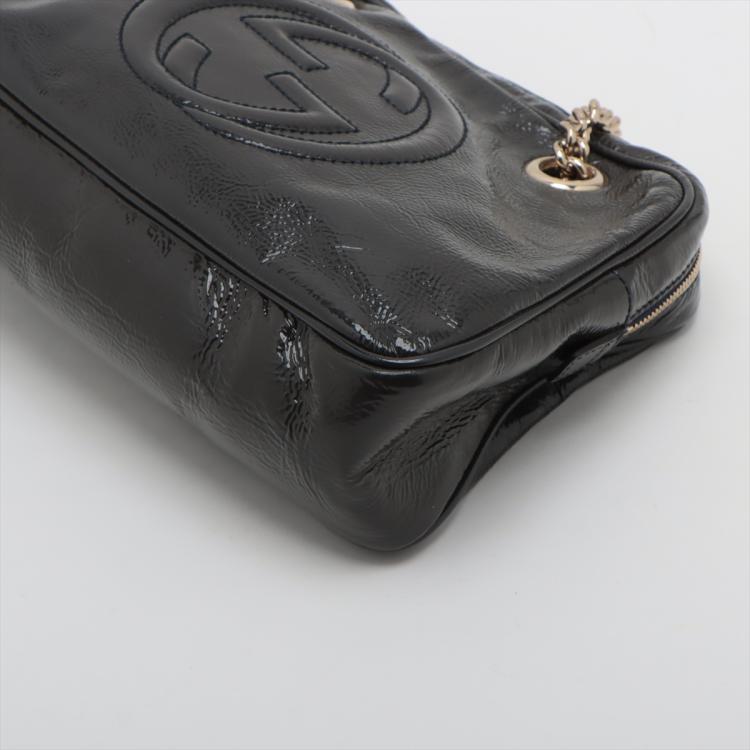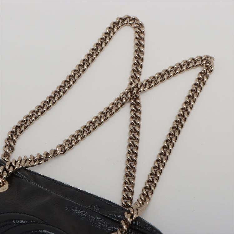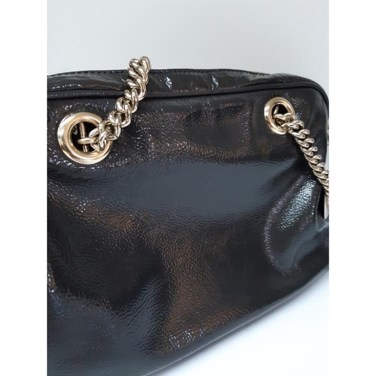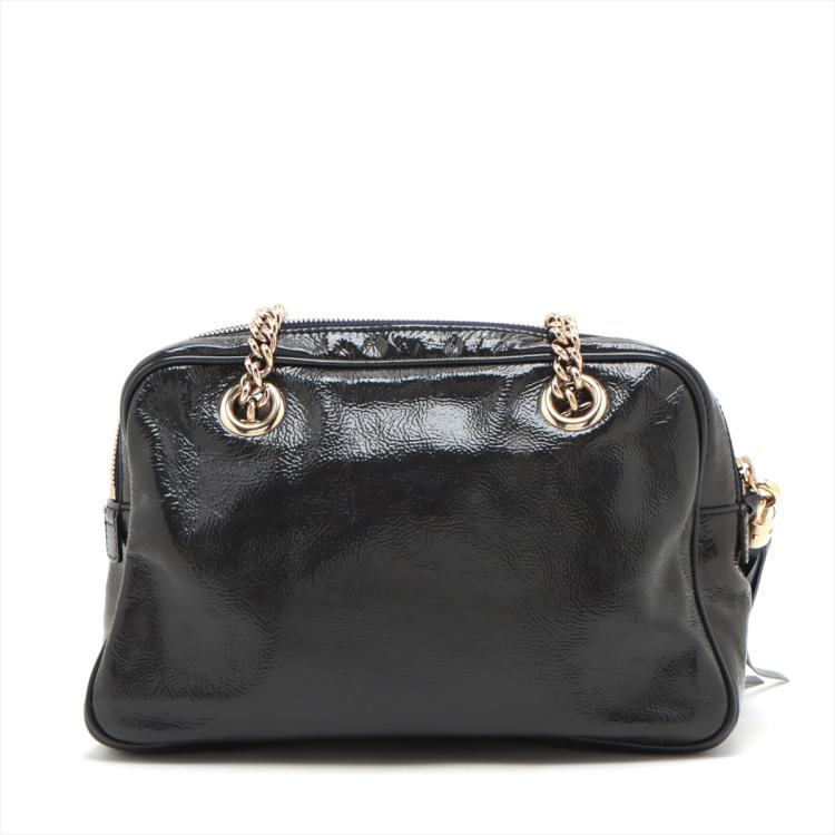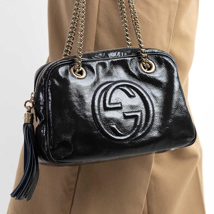 Gucci Soho chain shoulder bag in navy blue to grey patent leather. Featuring a large stitched frontal GG logo, light gold tone hardware, a gold tipped tassel as zipper puller. This opens to a natural linen interior with zipped and patch pockets. Approximate dimensions: 28cm(L) x 17.5cm(H) x 8cm(D), 24cm double gold chain drop height. Accompanied by a Gucci dust bag. With Entrupy Certificate of Authenticity. (Pre-owned)