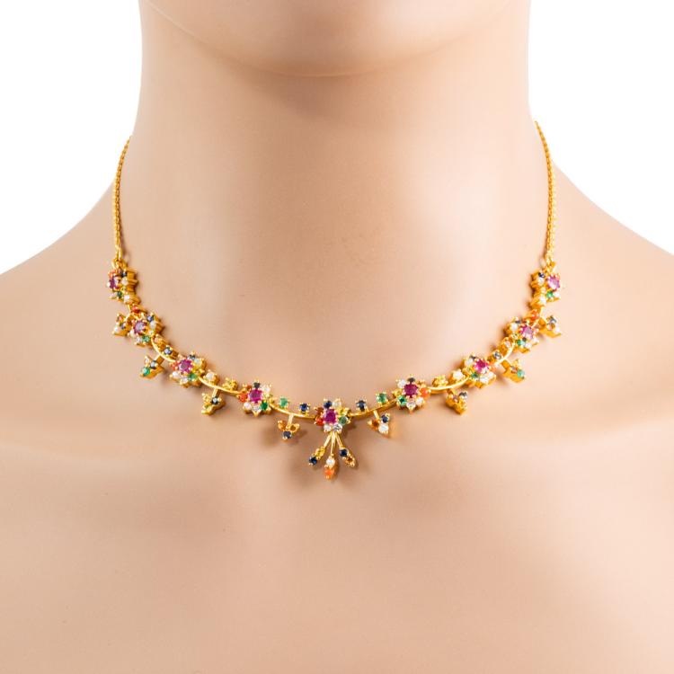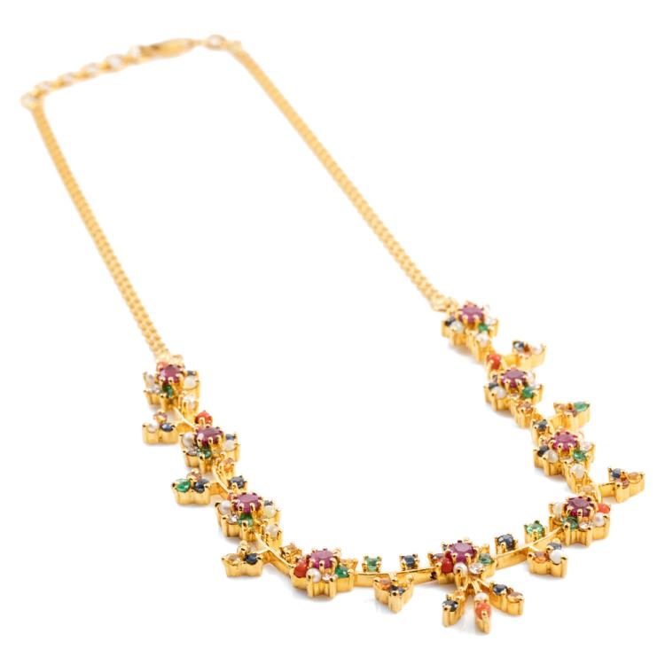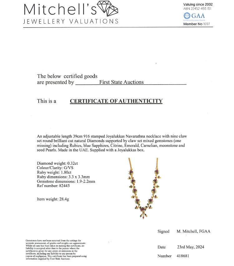 Joyalukkas Navarathna necklace and round natural mixed gemstones (including 9 Rubies totalling approximately 1.80ct and blue Sapphire, Citrine, Emerald, Carnelian, Moonstone & seed Pearl of approximately size 1.9mm - 2.2mm) and 9 round natural Diamonds totalling 0.32ct (Estimated grading: G VS). Adjustable max length: 39cm. 22ct yellow gold with 916 stamp. UAE made. Weight: 28.4g. With Joyalukkas box. With Certificate #418681. (Pre-owned)