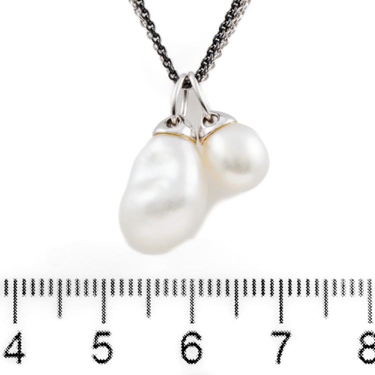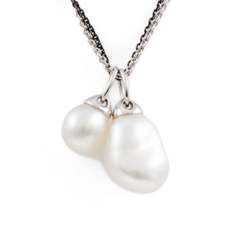 Kailis Pearl pendant with 2 Australian Keshi South Sea Pearls of sizes approximately 13.5 x 9.7 x 8.2mm and 9.2 x 7.1 x 7.0mm. 18ct white gold with 42cm 18ct white gold and black rhodium double trace chain. Weight: 7.2g. With Kailis Certificate of Authenticity #230903. (Pre-owned)