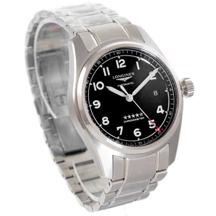 Longines Spirit stainless steel automatic mens watch. Black dial, date, case diameter: 40mm, wrist size: 19.5cm, Swiss made. Ref# L3.810.4.53.6. With Longines stainless steel bracelet and clasp. With FSA Certificate of Authenticity, Longines COSC Certificate card and Longines box. 3 month FSA warranty (As new, Note: minor scratch on bezel and back case due to being display stock)