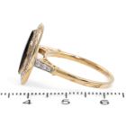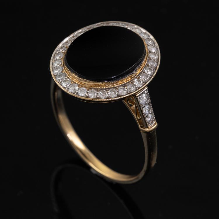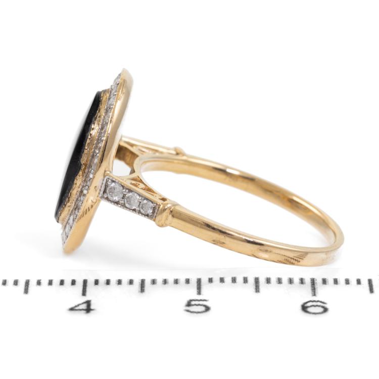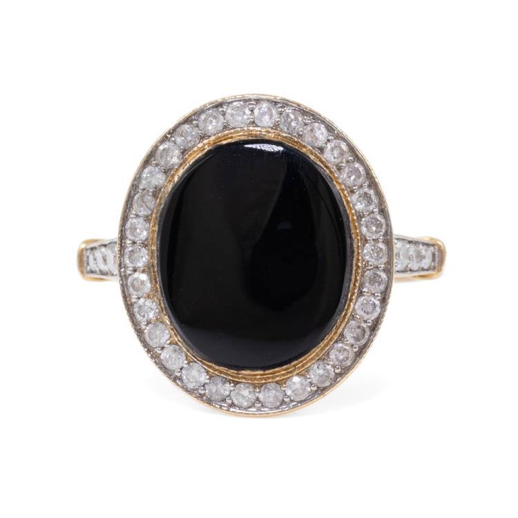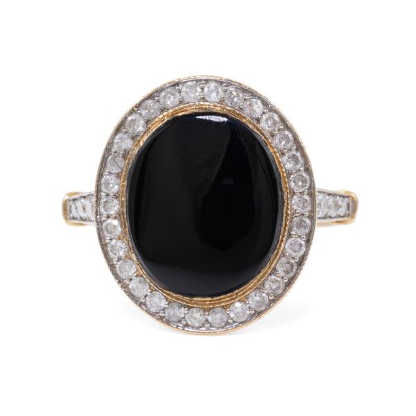 Onyx and Diamond ring with oval cabochon cut Natural Onyx of approximately 2.50ct and round Natural Diamonds totalling 0.46ct (Estimated grading: H-I P1). Ring size: Q. Band width: 1.7mm. 18ct yellow gold. Weight: 5.5g. (Pre-Owned)