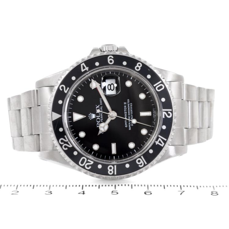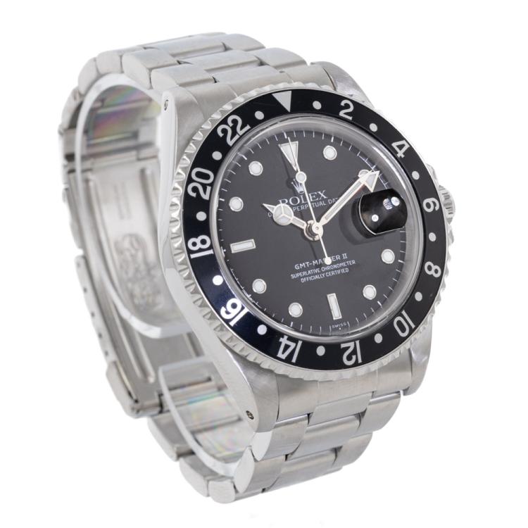 Rolex Oyster Perpetual GMT Master II stainless steel automatic mens watch. Black dial, date, case diameter: 40mm, wrist size: 17.5cm, Swiss made. Ref# 16710. Circa: 1999. With Rolex stainless steel Oyster bracelet and clasp. With Certificate of Authenticity and Rolex box. 3 month FSA warranty (Pre-owned)