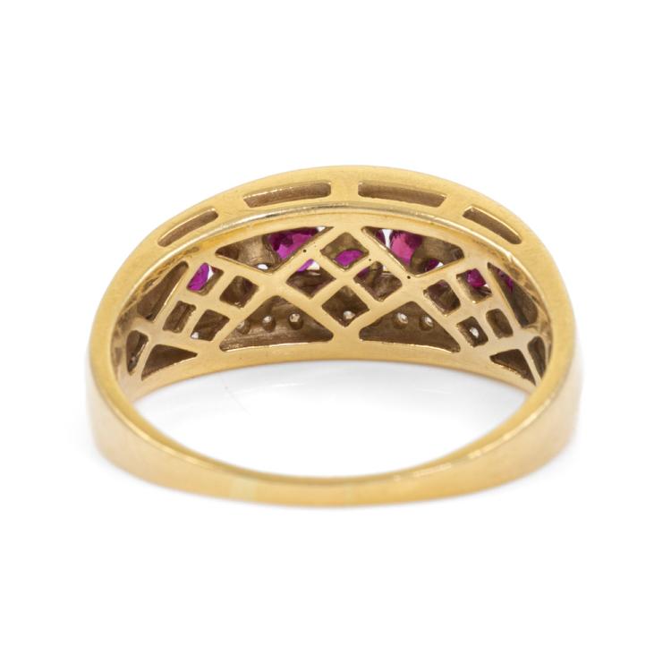 Ruby and Diamond ring with round natural Rubies totalling approximately 0.70ct and round natural Diamonds totalling 0.26ct. 18ct yellow gold. Ring size S. Band width: 1.4mm-5.7mm. Weight: 6.5g. With Valuation dated 10/11/23. (Pre-owned)