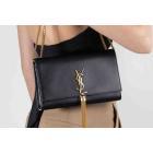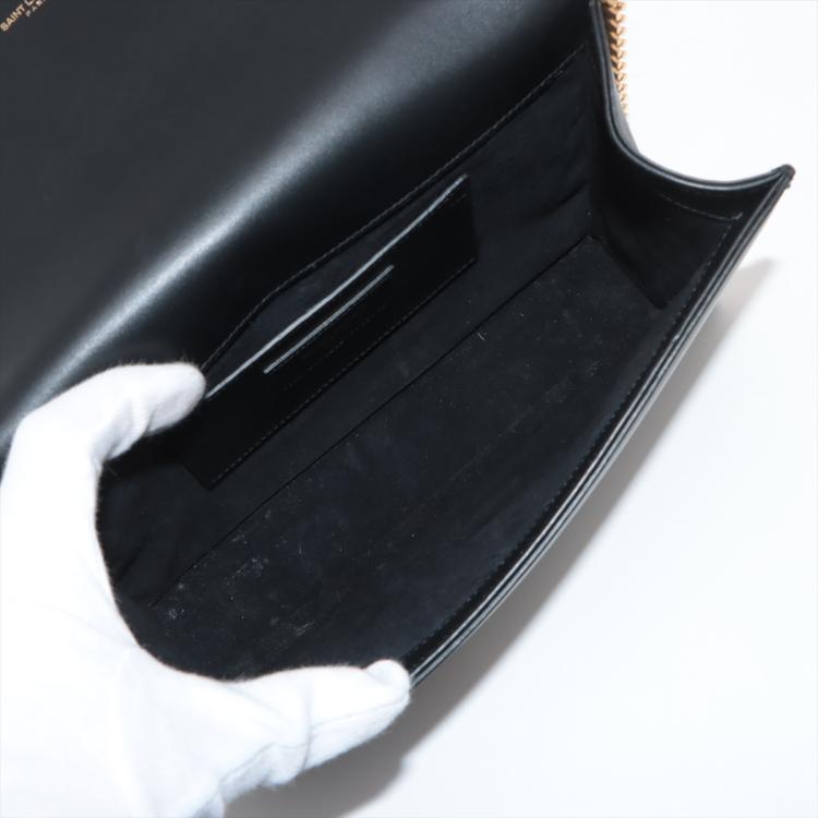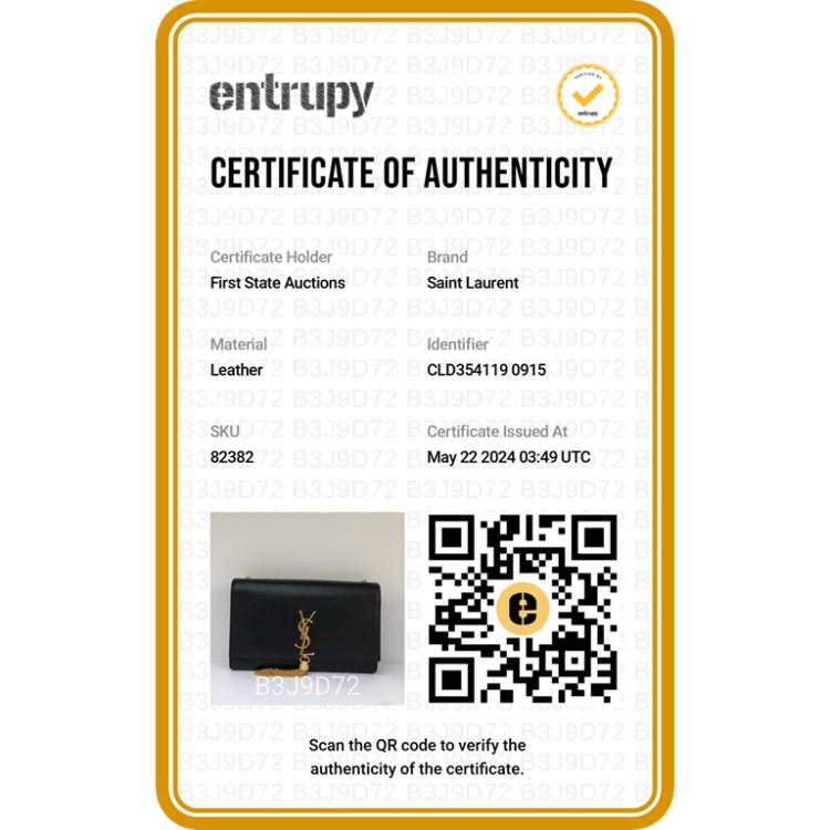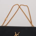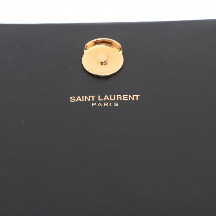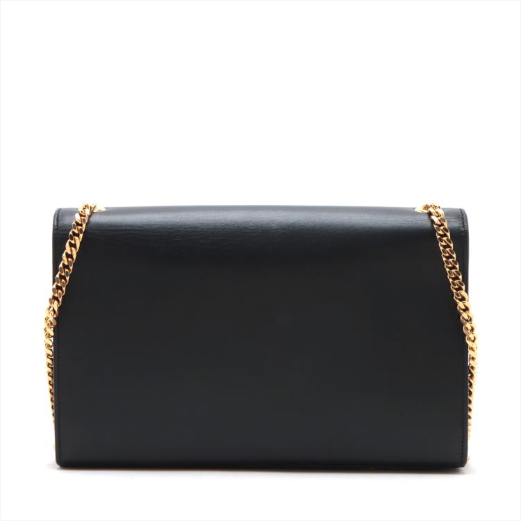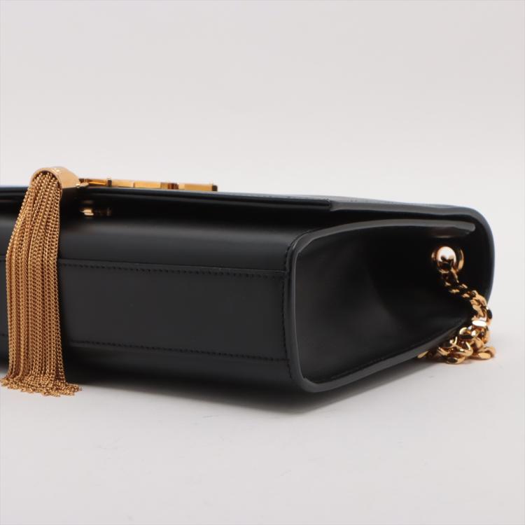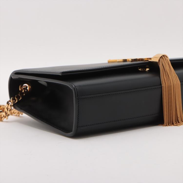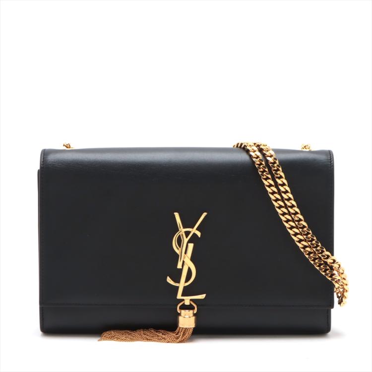 Saint Laurent medium Kate tassel bag in black smooth calfskin. Featuring gold-toned hardware, logo plaque with chain tassel, fold over flap with magnetic snap closure at front. This opens to a black fabric lining interior with a flat card slot. Approximate dimensions: 24cm(L) x 15cm(H) x 5cm(D), and 55cm shoulder chain drop. Accompanied by a Saint Laurent dust bag. With Entrupy Certificate of Authenticity. (Pre-owned)