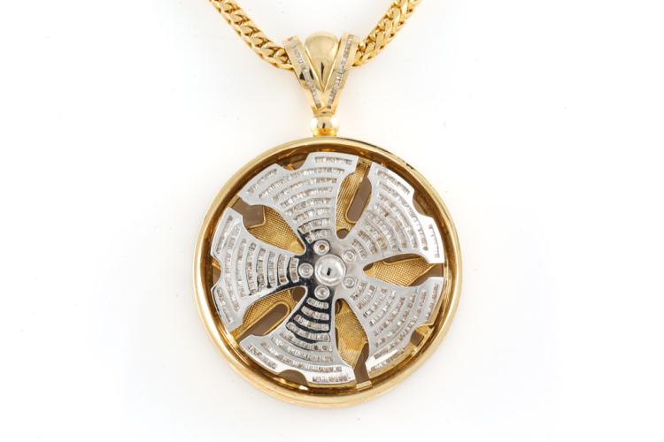 Wheel of Fortune Diamond pendant with baguette cut natural Diamonds totalling 1.25ct (Estimated grading: J P2). 14ct yellow gold and white gold with 80cm 10ct yellow gold chain. Weight: 108.1g. With certificate #416900. (Pre-owned)