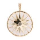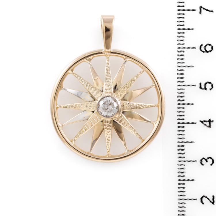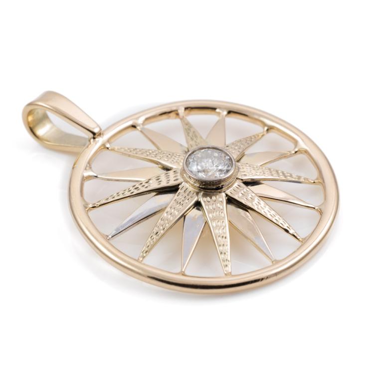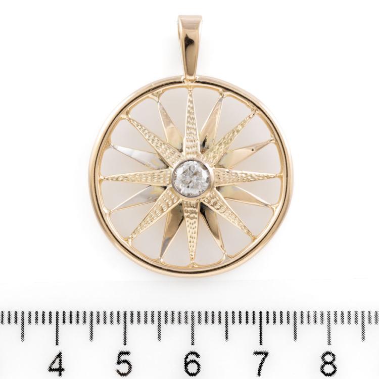 Diamond pendant with a round Natural Diamond of approximately 0.40ct (Estimated grading: H P2). 11ct yellow gold XRF tested (stamped 9ct). Rhodium plating around the diamond and some rhodium on the spokes. No chain provided. Approximate dimension: 38mm (including bale) x 31mm. Weight: 6.5g (Pre-owned)