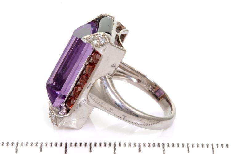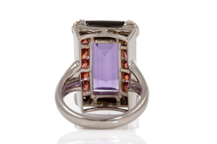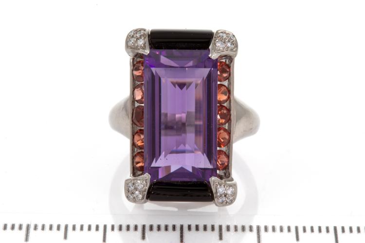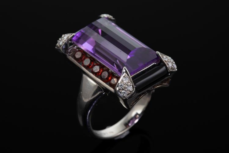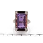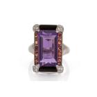 Natural Amethyst, Onyx and Diamond ring with fancy rectangular cut Amethyst of 10.26ct, Onyx totalling 3.91ct and round garnets totalling 1.20ct and round Diamonds totalling 0.10ct. 18ct white gold. Ring size M. Weight: 12.2g. (Pre-owned)