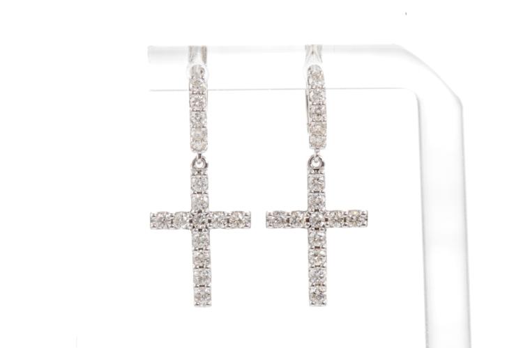 Diamond hoop Cross earrings with 32 round Natural Diamonds totalling 1.14ct (Estimated grading: H SI). 14ct white gold. Item length: 32mm. Weight: 4.3g. (New).