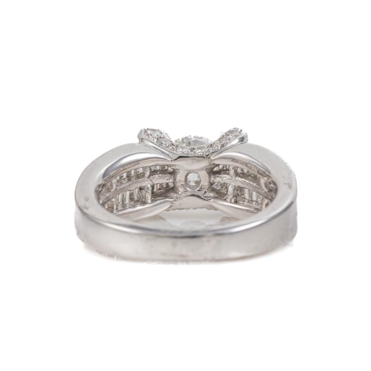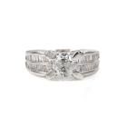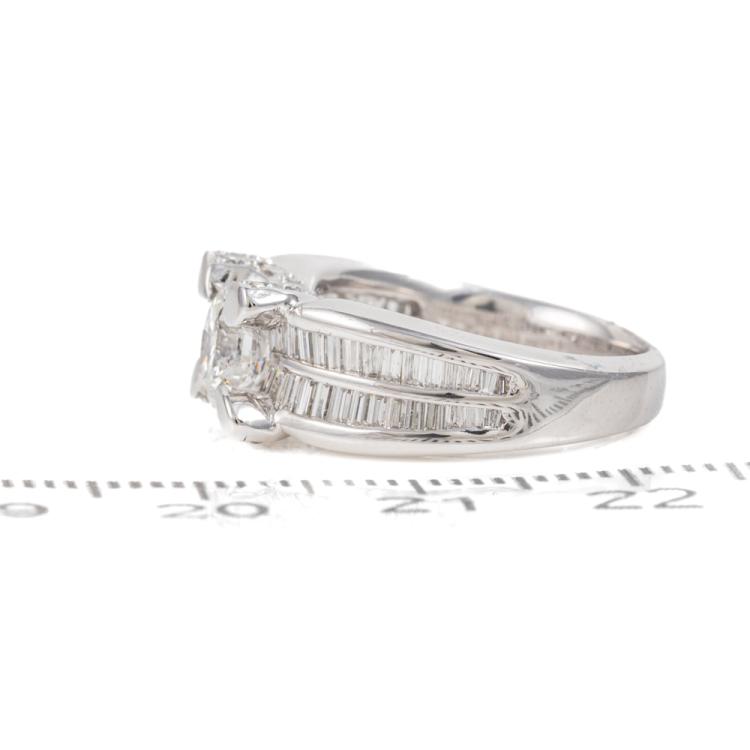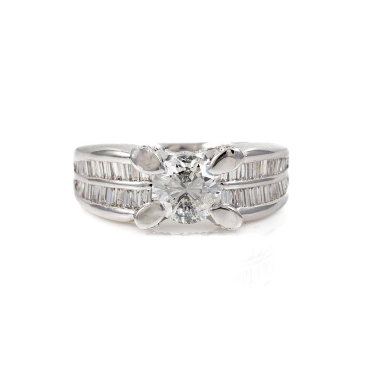 Diamond dress ring with a centre round Diamond of 0.96ct (Estimated grading G P2-P3 - with surface reaching inclusions) and baguette & round Diamonds totalling 1.01ct (Estimated grading: G VS-SI). Platinum-900. Ring size J- ring resizing is not recommended. Band width: 3.6mm - 6.0mm. Weight: 10.2g. With certificate #416453. (Pre-owned)