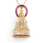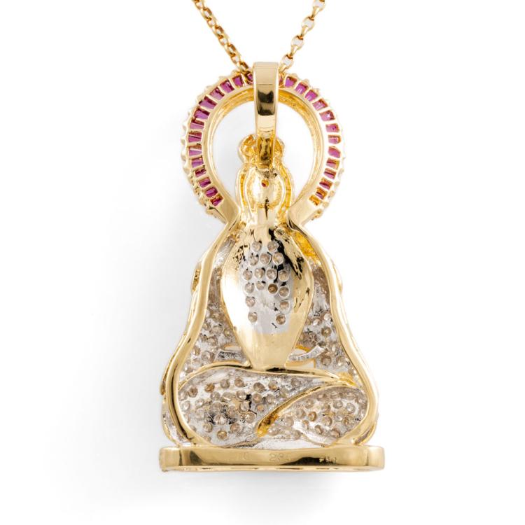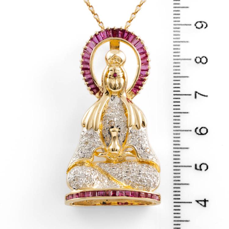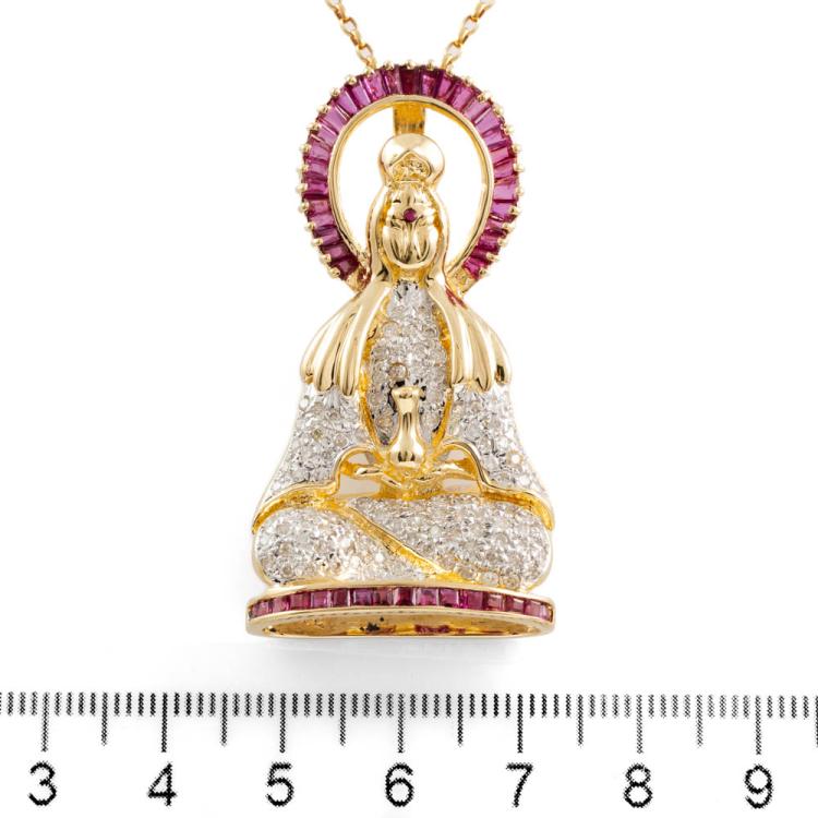 Ruby and Diamond Guanyin pendant with square and baguette cut natural Rubies totalling 2.38ct and natural round Diamonds totalling 1.18ct (Estimated grading: L-M P2). 18ct yellow gold with yellow gold 43cm chain. Pendant measurements: 48mm x 25mm. Weight: 21.6g. With Certificate. (Pre-owned)