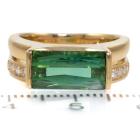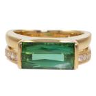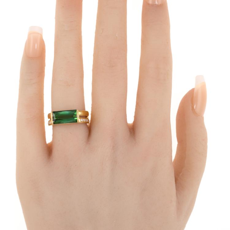 Tourmaline and Diamond ring with emerald cut natural green Tourmaline of 3.17ct and round natural Diamonds totalling 0.11ct. 18ct yellow gold. Ring size I1/2. Minimum band width: 3.3mm. Weight: 7.8g. (Pre-owned)