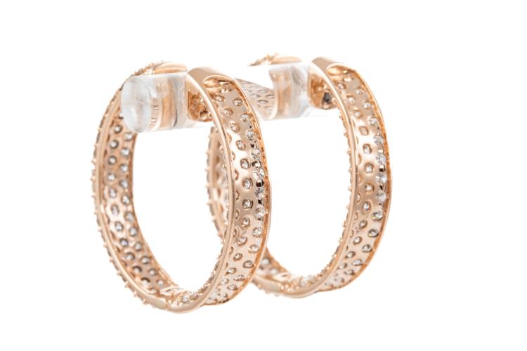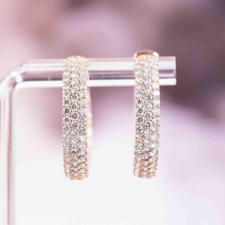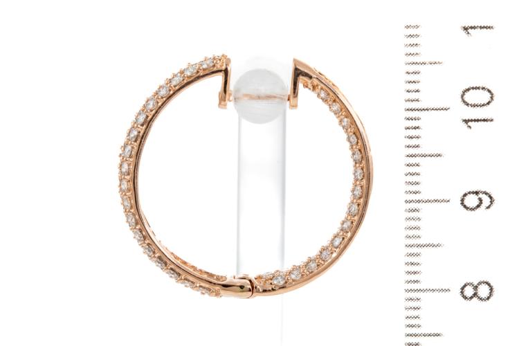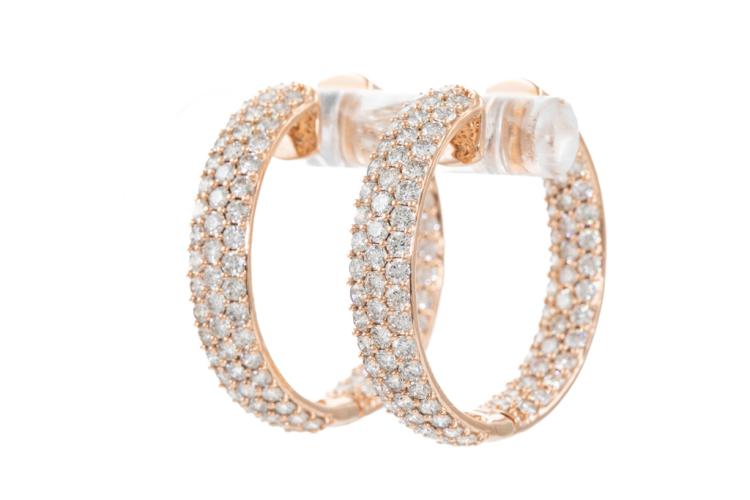 Diamond hoop earrings with 196 round Natural Diamonds totalling 4.08ct (Estimated grading: H-I SI-P1). Back of the hoop has the Diamonds set inside the hoop. 14ct rose gold. Hoop diameter: 2.6cm. Width: 5.1mm. Weight: 8.0g. With Valuation Certificate #417723. (New).