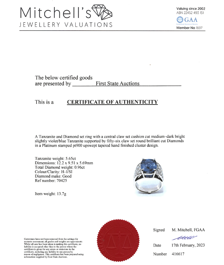 Tanzanite and Diamond ring with cushion cut Tanzanite of 5.65ct and round Diamonds totalling 0.96ct (Estimated grading: H-I SI). Platinum - 900. Ring size I - ring resizing is not recommended. Weight: 13.7g. With certificate #416617. (Pre-owned)