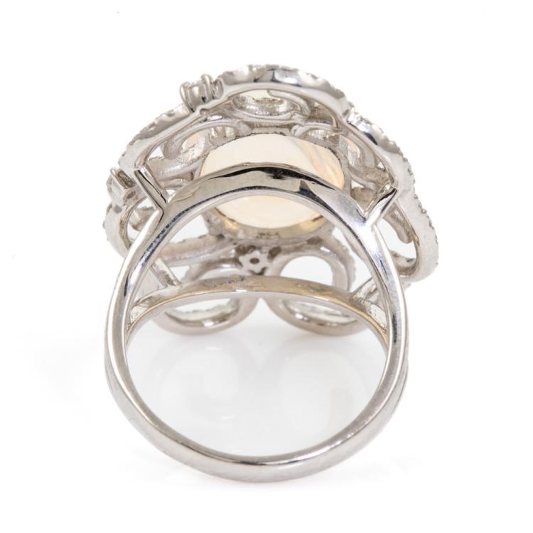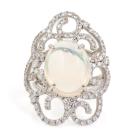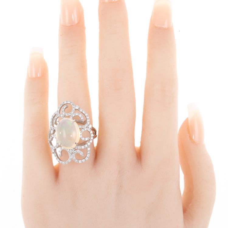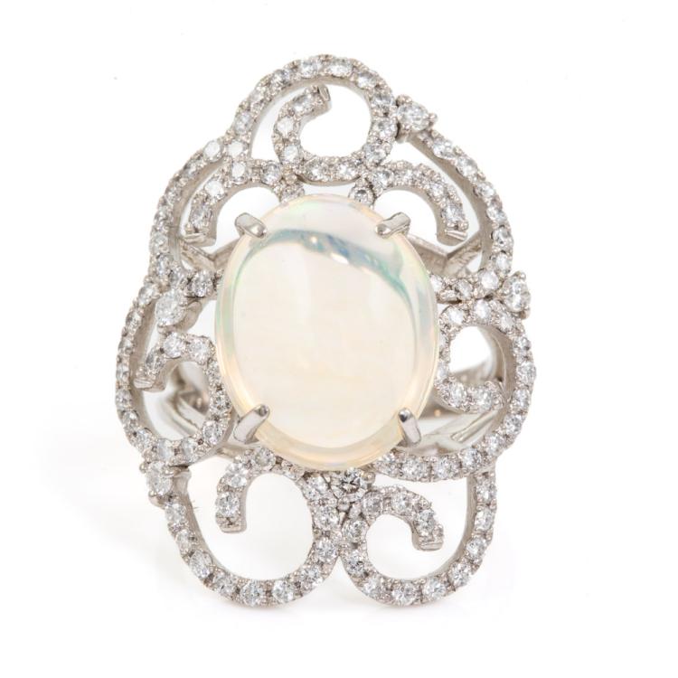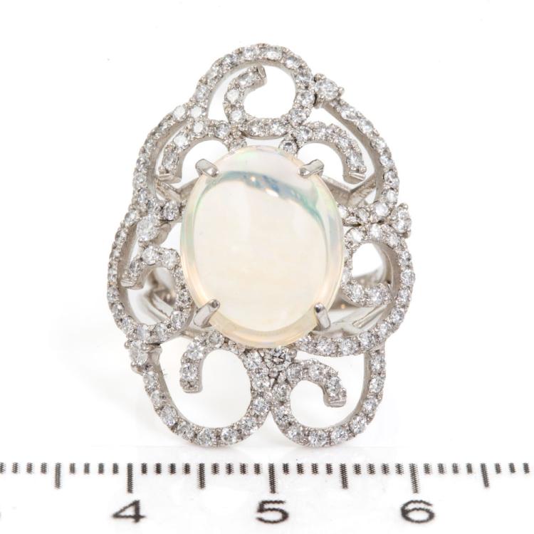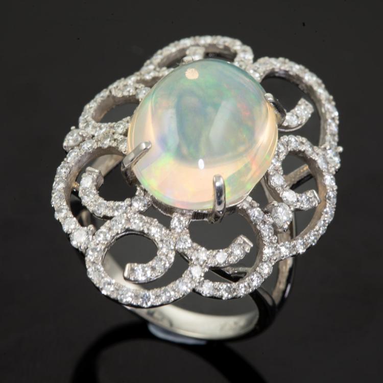 Opal and Diamond ring with oval cabochon cut solid Natural Crystal Opal of 5.98ct and round Natural Diamonds totalling 1.09ct (Estimated grading: G-H VS-SI). Platinum 900. Ring size L 1/2 - ring resizing is not recommended. Minimum band width: 2.4mm. Weight: 10.6g. (Pre-owned)