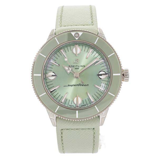Breitling Superocean Heritage 57 Pastel Paradise stainless steel automatic ladies watch. Mint green dial, case diameter: 38mm, wrist size: 17.5cm, Swiss made. Ref# A10340361L1X1. With Breitling mint green leather strap and clasp. With Breitling Quick Start Guide Warranty Card Holder and Breitling box. 3 month FSA warranty (As new, NOTE: minor scratches on case and light wear on strap due to being display stock.)
